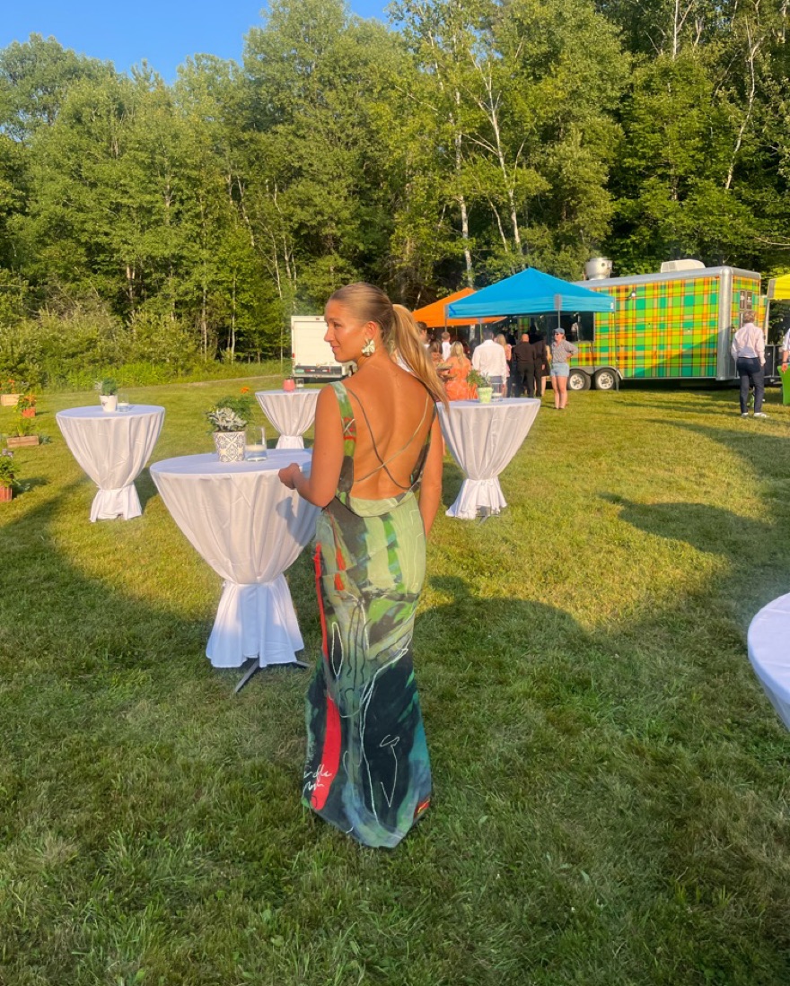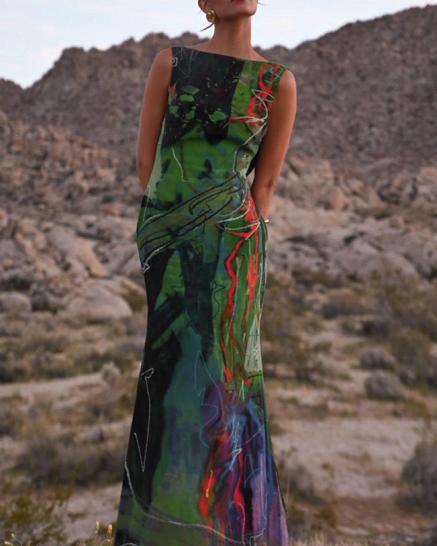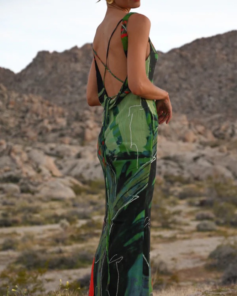 Worn 1x. Fits like a glove. Designed to flatter, the Rhae Dress is a maxi length dress with a boatneck, cowl open back, and adjustable cross back tie in our hand-drawn Terrain print. Wear the straps tied in a bow or let them dangle for a completely open back.