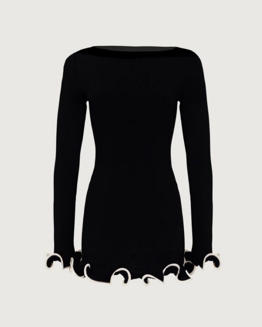 long sleeve | boat neckline | structured ruffle hem | black with white ruffle