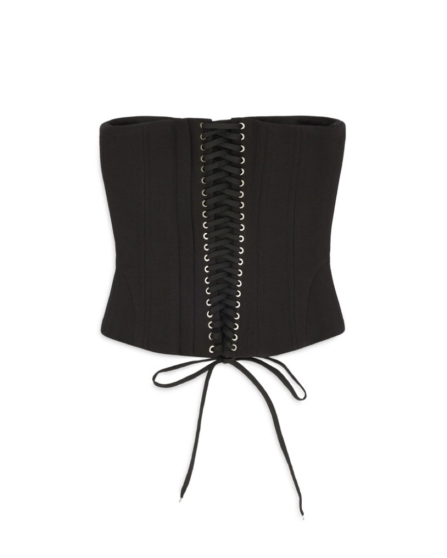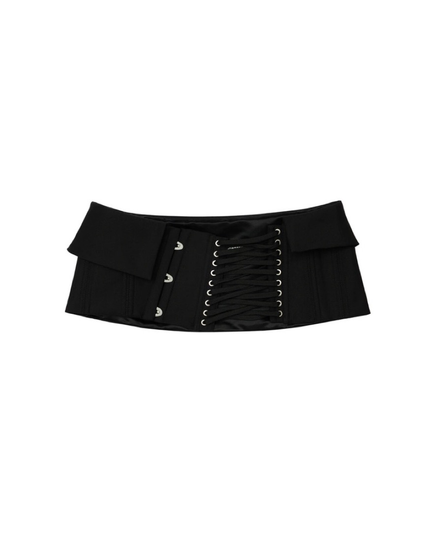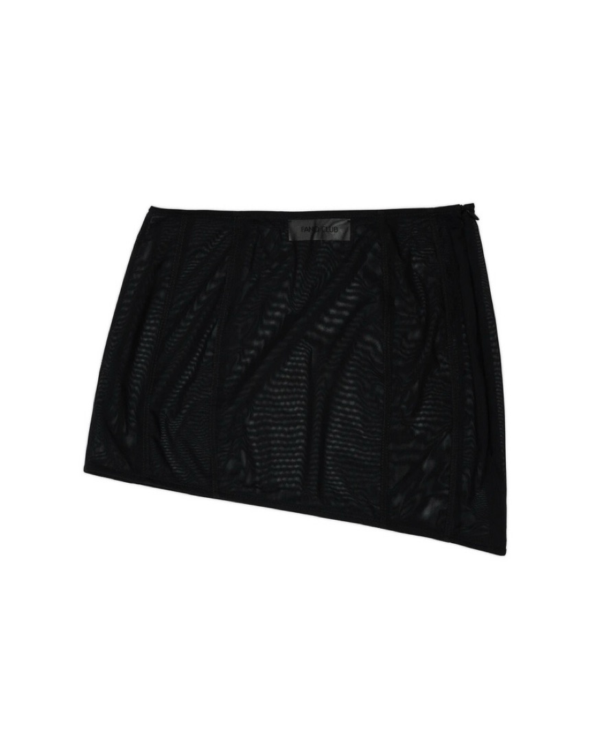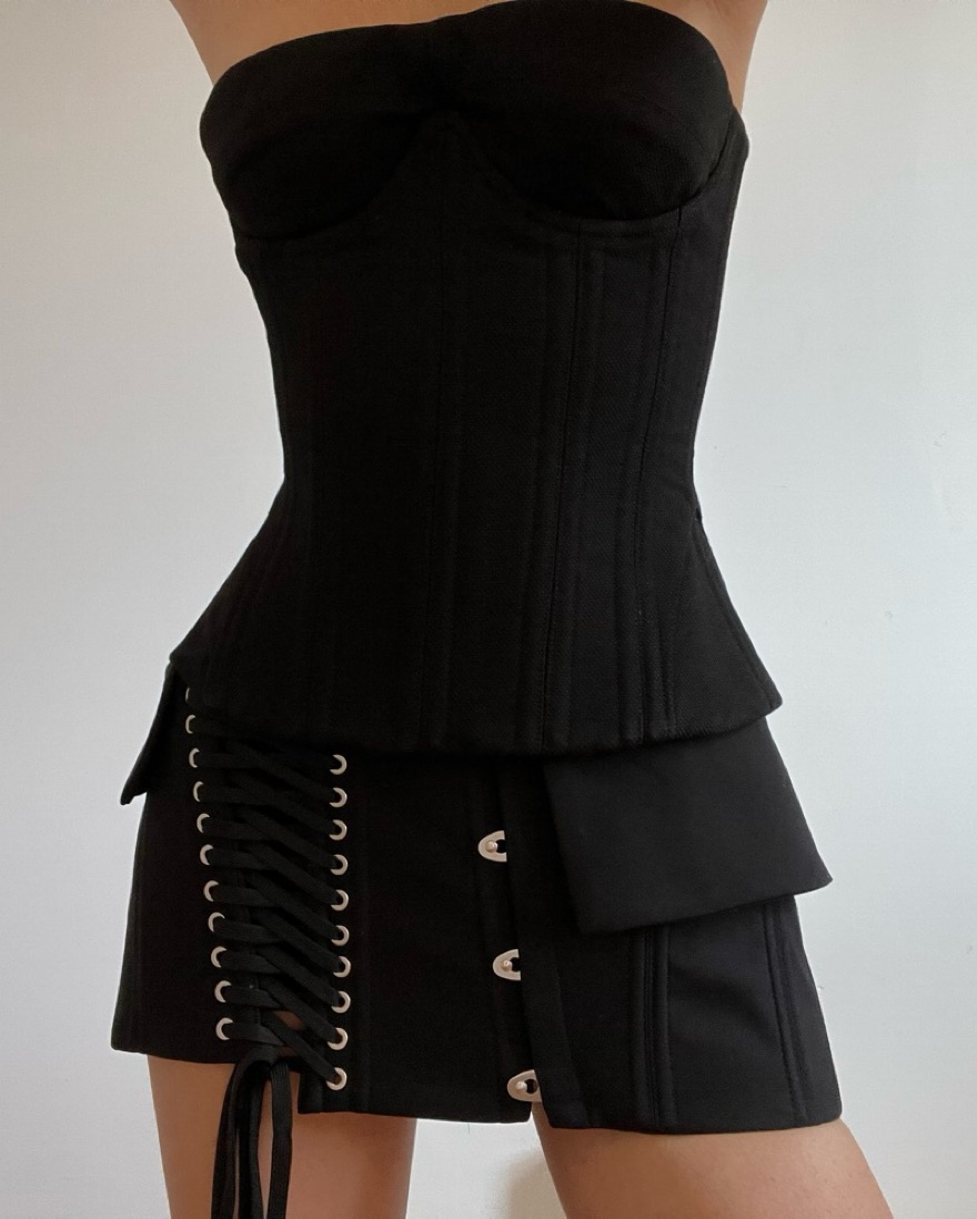 Fanci club cupped corset and vines mini skirt in black. Skirt comes with a sheer mini underskirt.