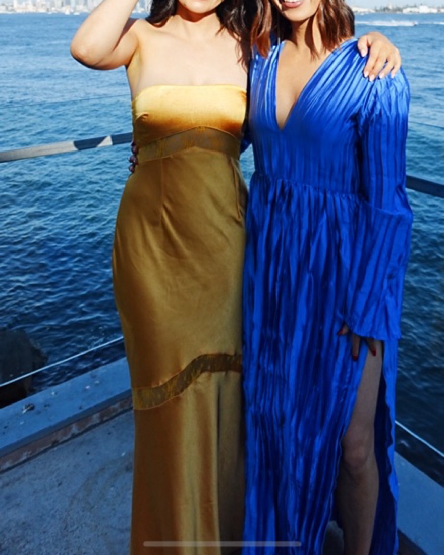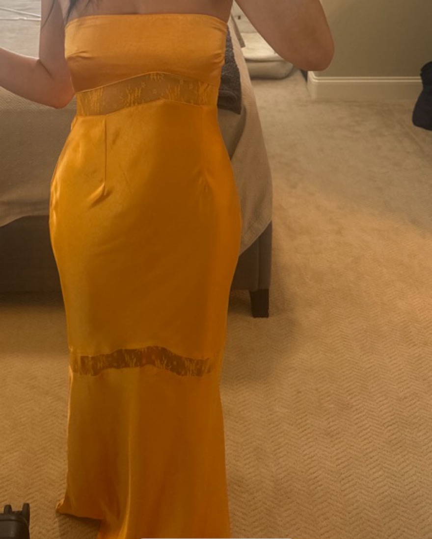 In color golden, size small, 5'7 for reference, waist tailored ~1 inch in. Worn only once for a wedding