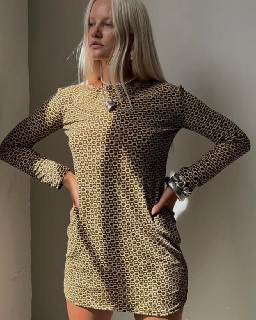 One-of-a-kind open-back dress upcycled from a vintage 1970s lurex fabric. The shimmery tile print on this dress is so funky and retro. Would best fit a size XS/S. Perfect for clubs , Halloween, or 1970s theme parties. This dress is from Caro Uccellino—a handmade and sustainable small brand in LA.