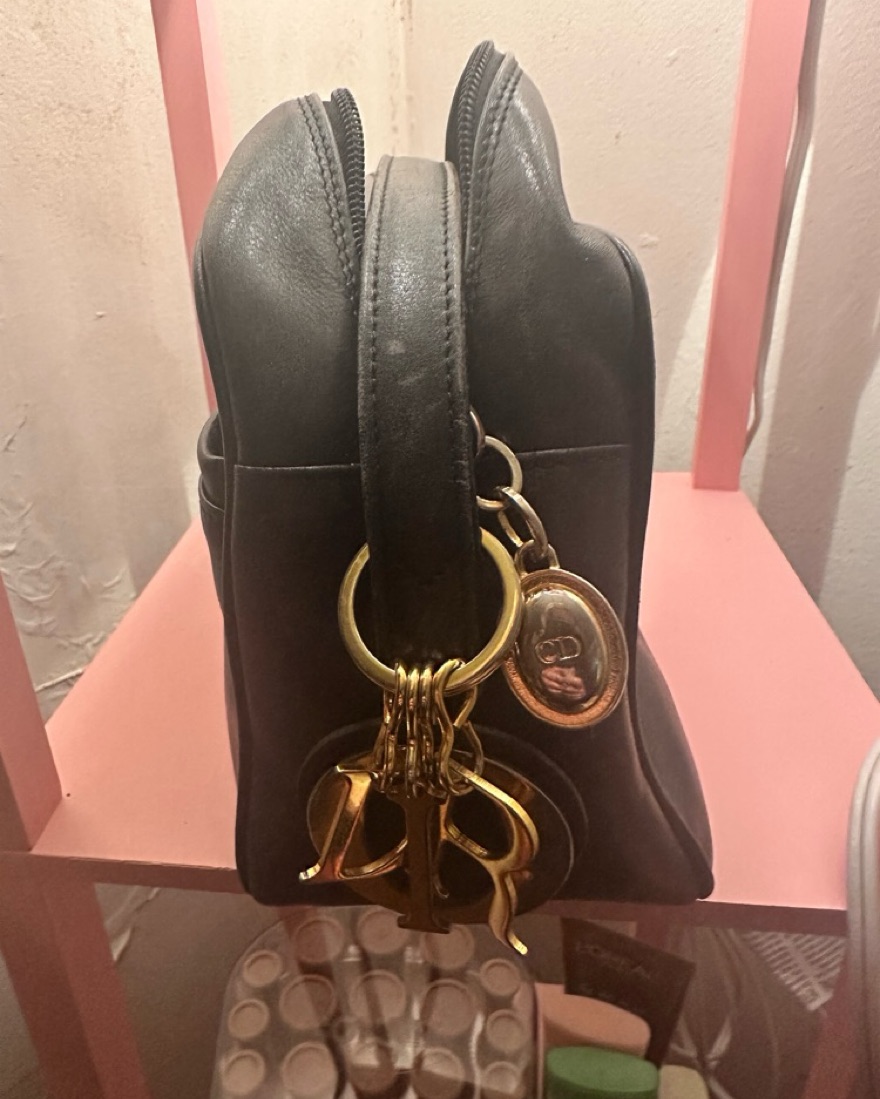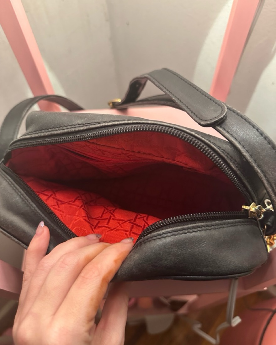 black Dior crossbody with buttery soft leather, red interior, and branded charm.