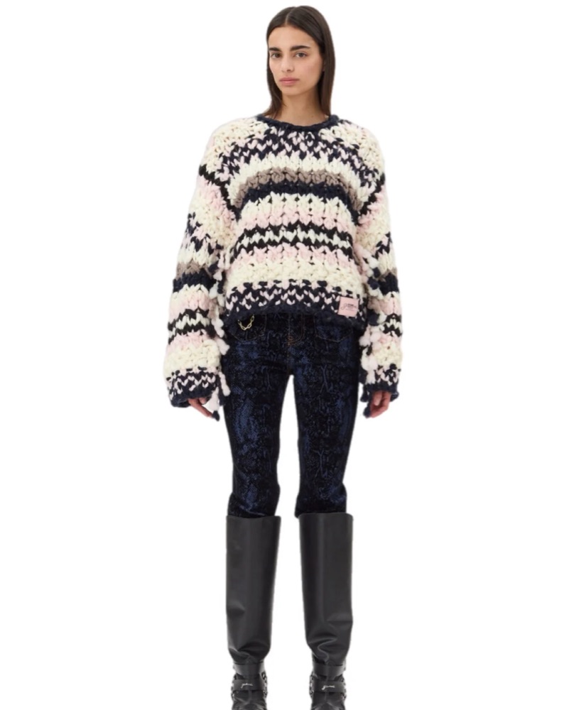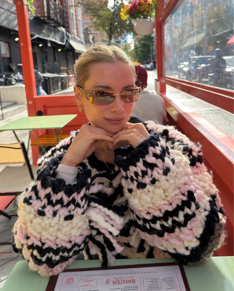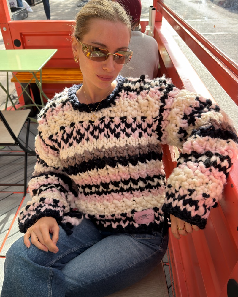 Hand knit, fits sizes S-M, depending on your fit preference (loose or tighter)