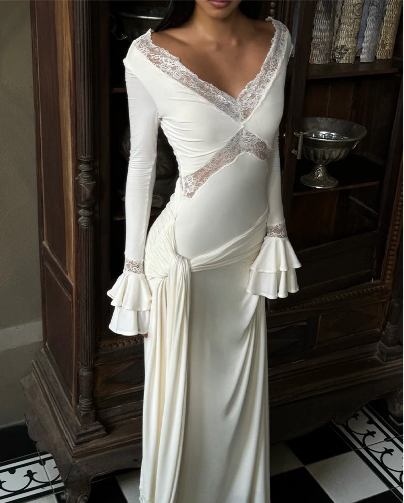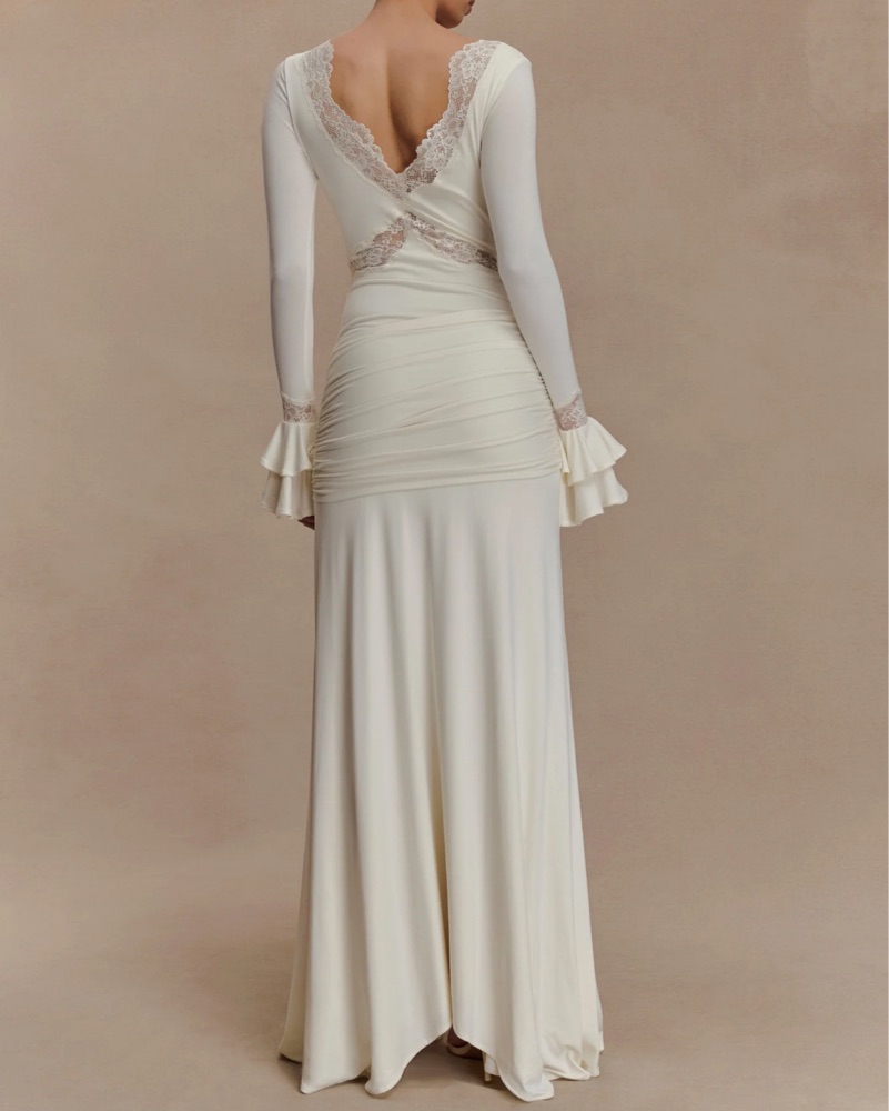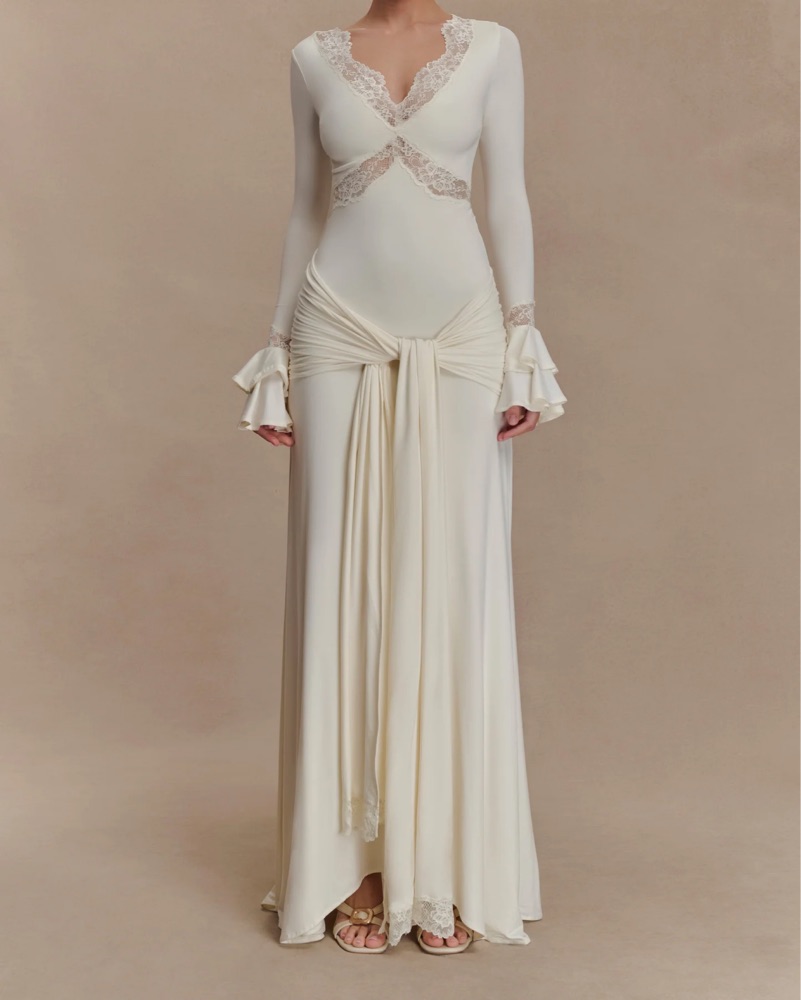 Be advised this dress has a odd gaping around the arm pits if you’re smaller framed - you can slightly see on 3rd photo. I wore off the shoulder and it still looks beautiful. It’s an XS but I’d say closer to a small