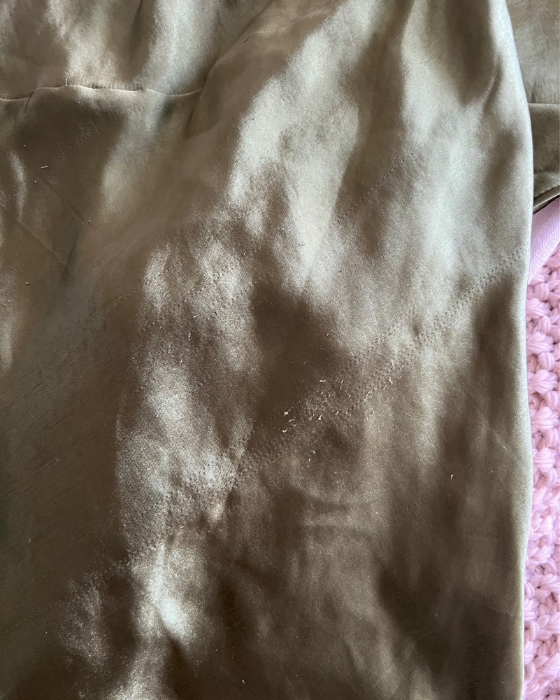 True to size. Non stretch silky fabric. Side zipper with hook and eye. A little bit of snagging at the back of the dress but nothing super noticeable (pictures included).