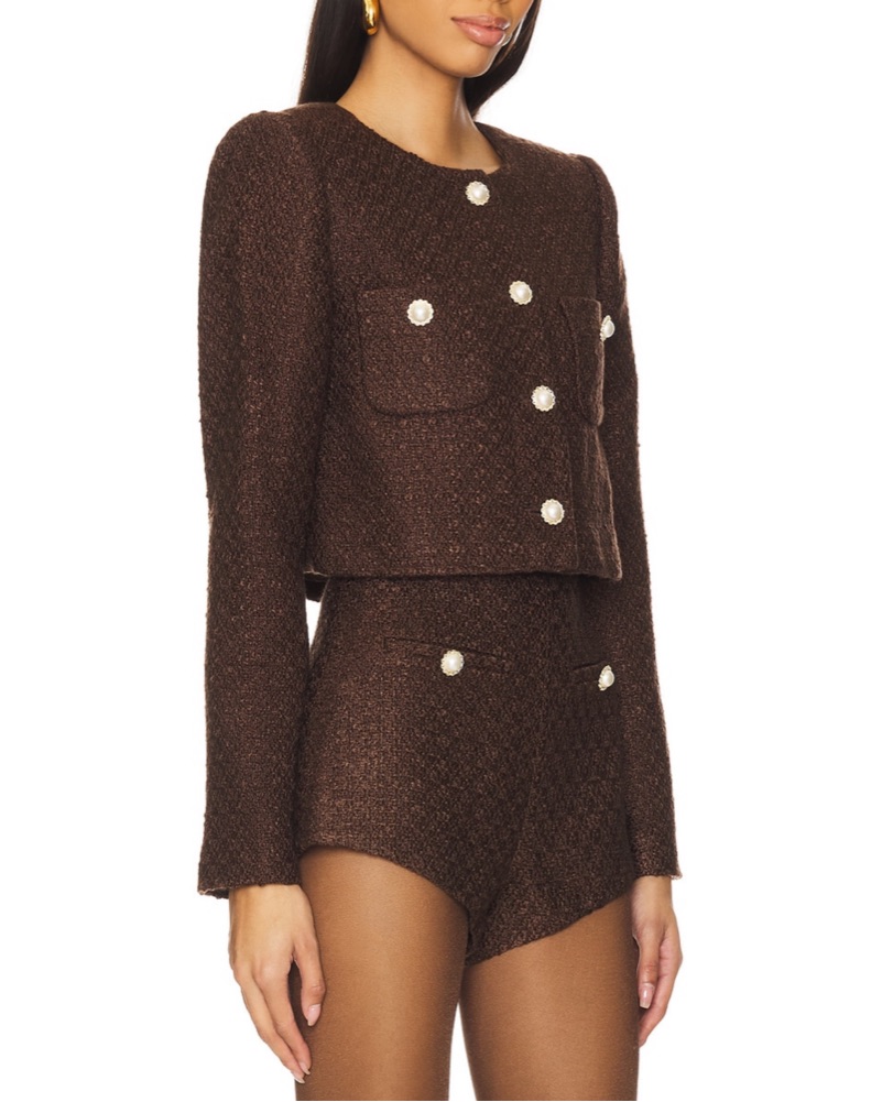 Renting my chocolate brown set from revolve the brand is Majorelle called the riah jacket so cute for travel or a day in nyc wore once to Paris trip comes with the jacket and the shorts message me if you want 1 item separately