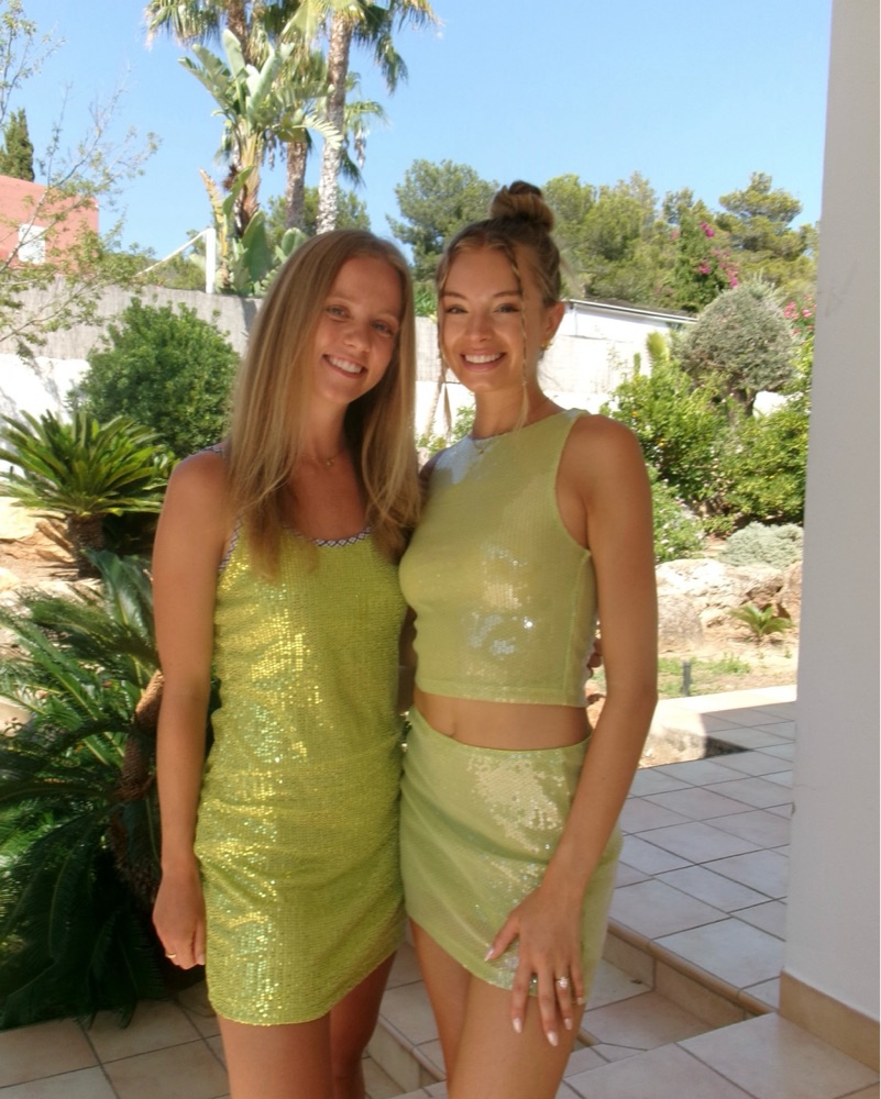 Fun green sequin halter tank and matching mini skirt! Perfect outfit for a concert, vacation, or bachelorette party!
