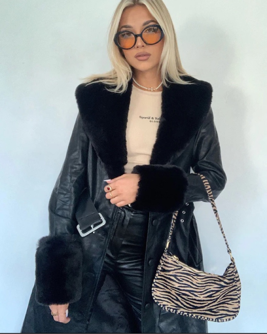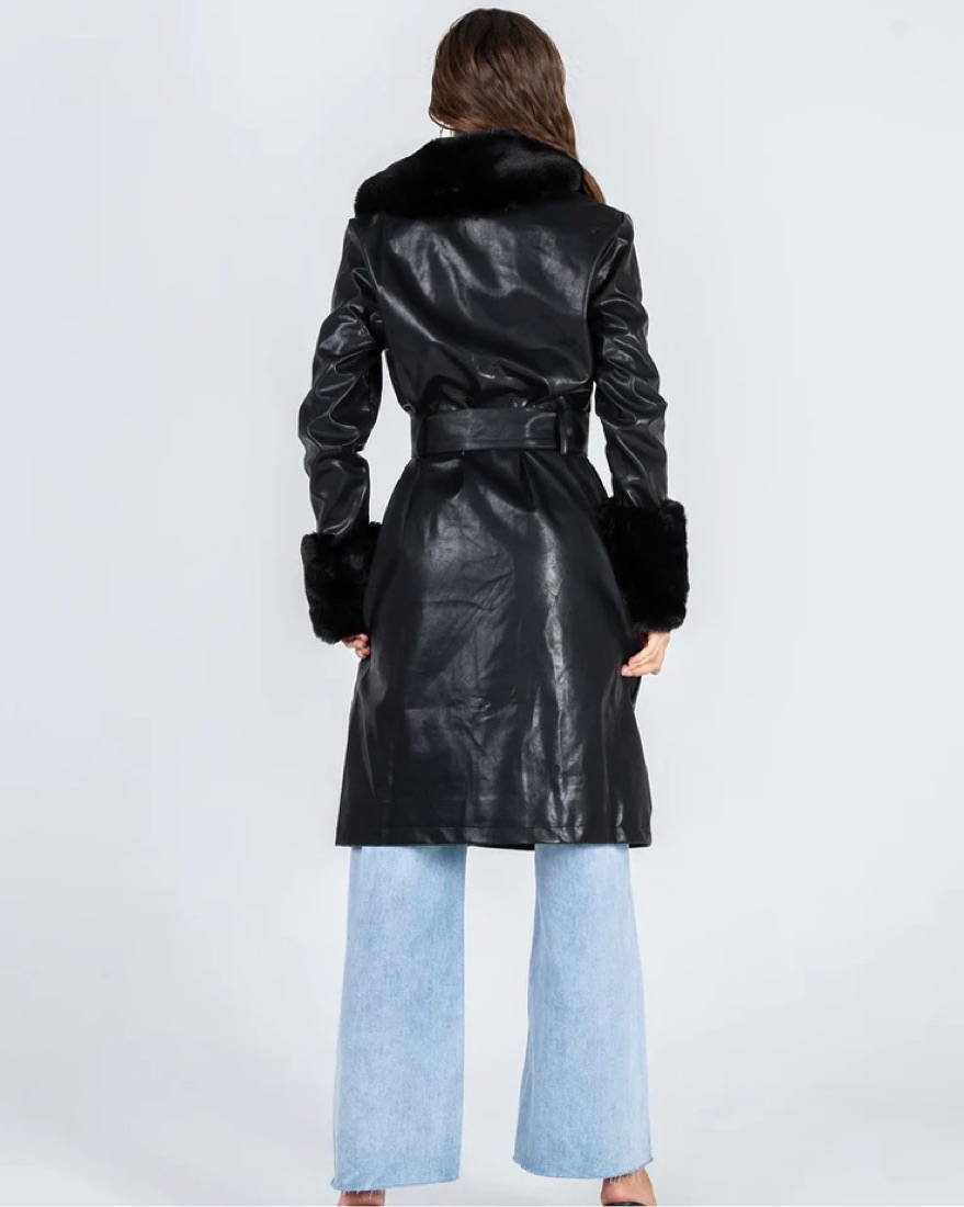 Long black coat with faux fur trim. Belt is removable! Will keep u warm and cute!