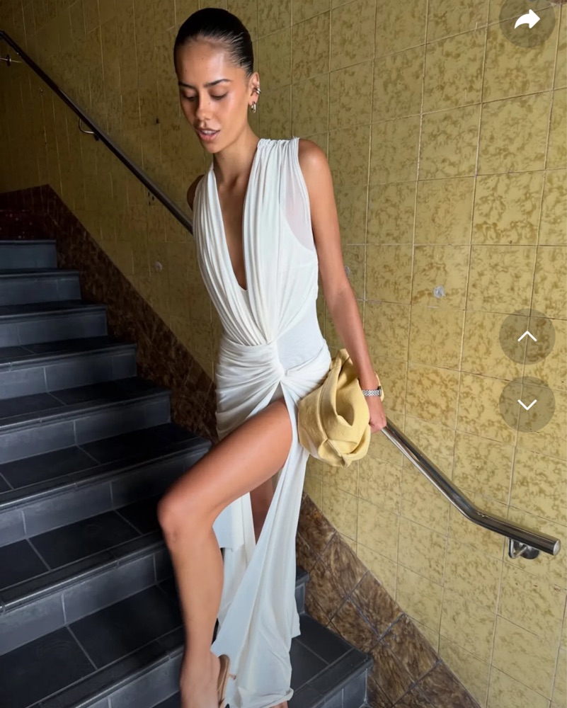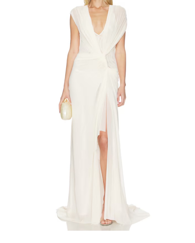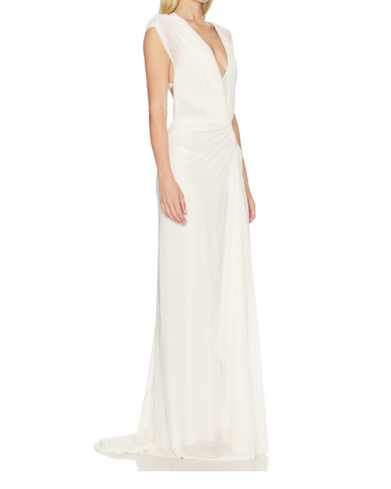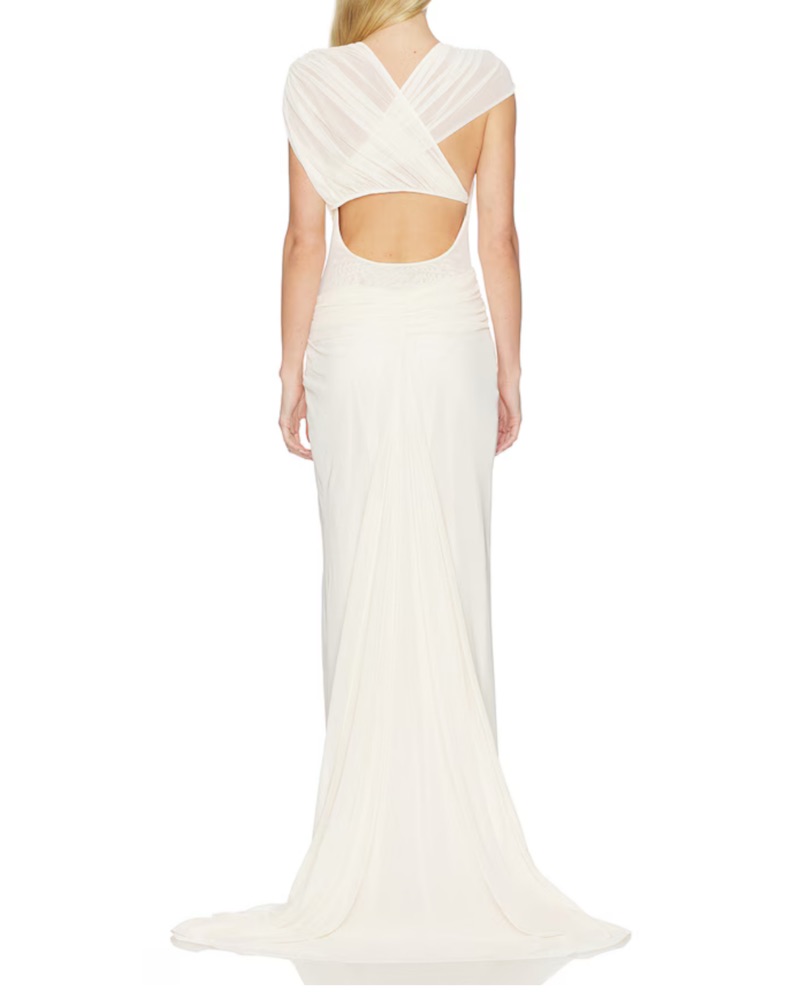 Leia Drape Gown in Butter Cream. This stunning soft mesh maxi dress features a captivating draped overlay and a dramatic train, creating a sophisticated silhouette perfect for a bridal dress, wedding celebrations, or any grand formal event.