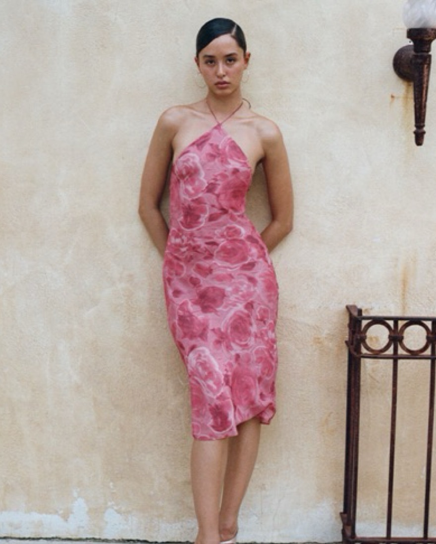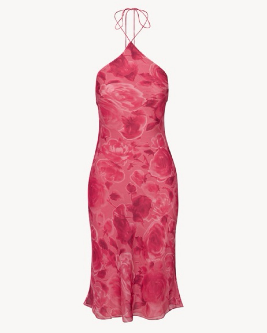 As worn by Alexandra Saint Mleux! Super cute midi dress with 90s pink floral pattern (Crush). True to size - fits slightly large on me (I am an XS - measurements in bio for reference). Never worn. Fabric is delicate as it is 100% silk - please handle with care.