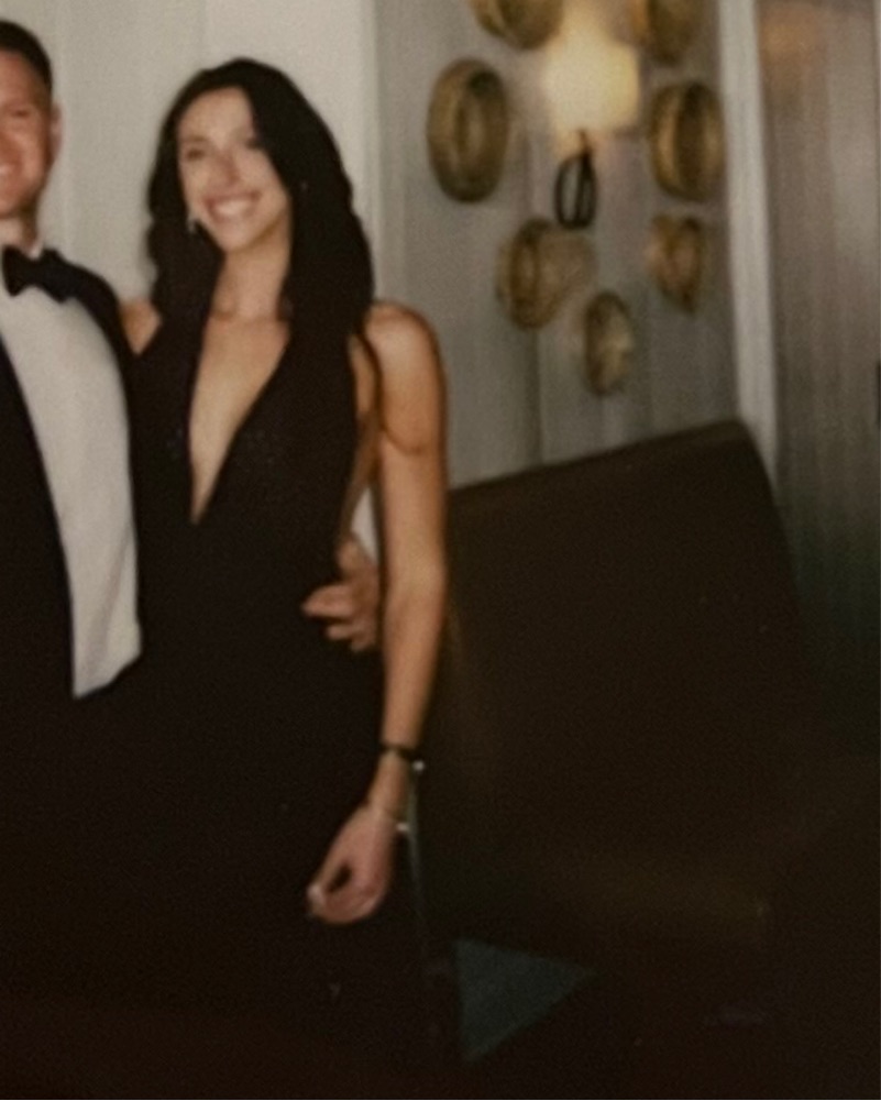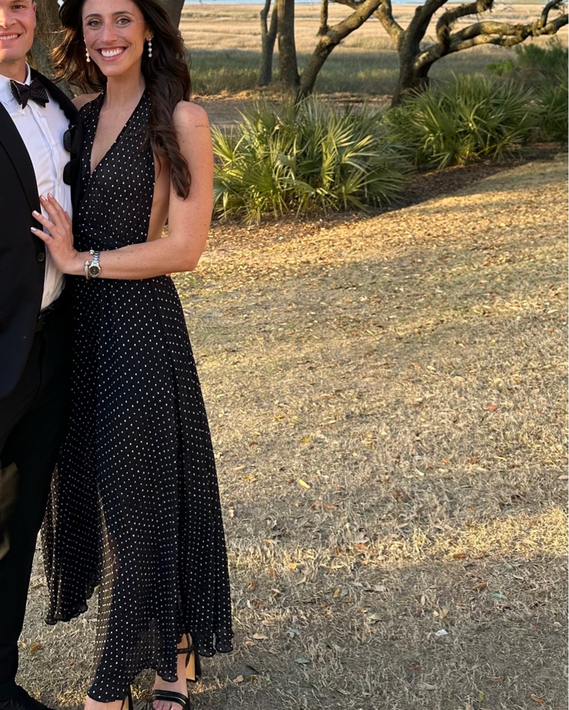 Polka dot semi sheer maxi dress perfect for black tie or formal weddings.