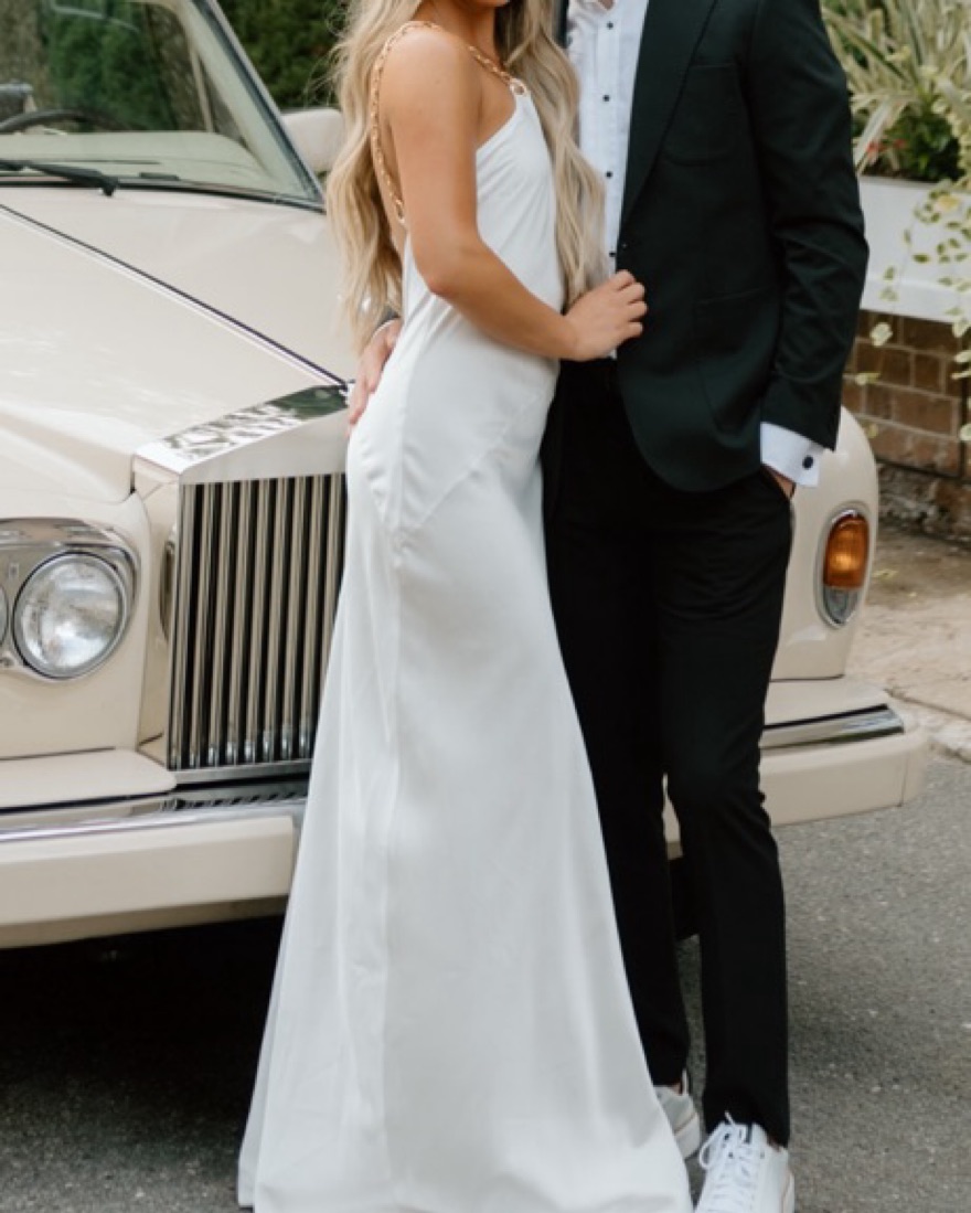 Fashion nova white satin dress with chain detail! Worn once for an hour for my engagement photos! Fits true to size, not hemmed. (I just wore super tall platform heels)