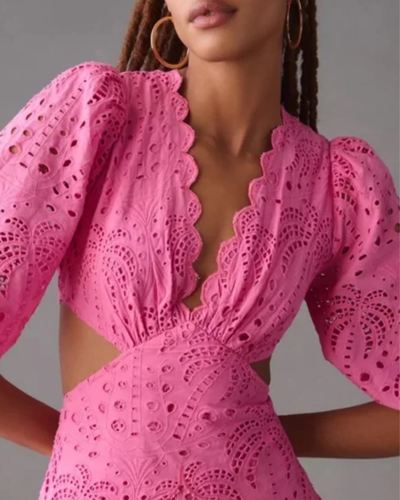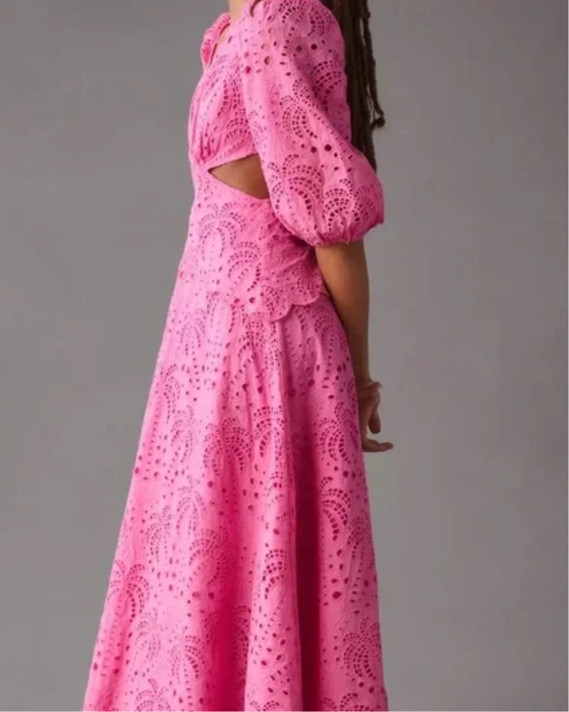 Farm Rio Pink Scalloped Palm Eyelet Cutout Midi Dress Size S. Never worn with tags!!