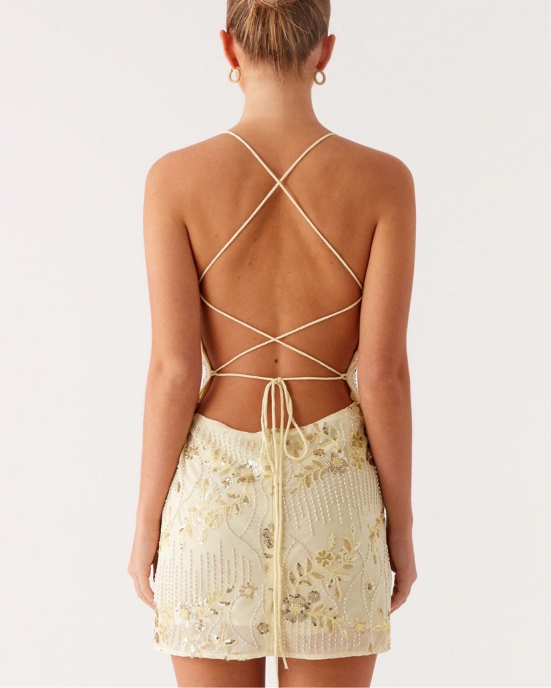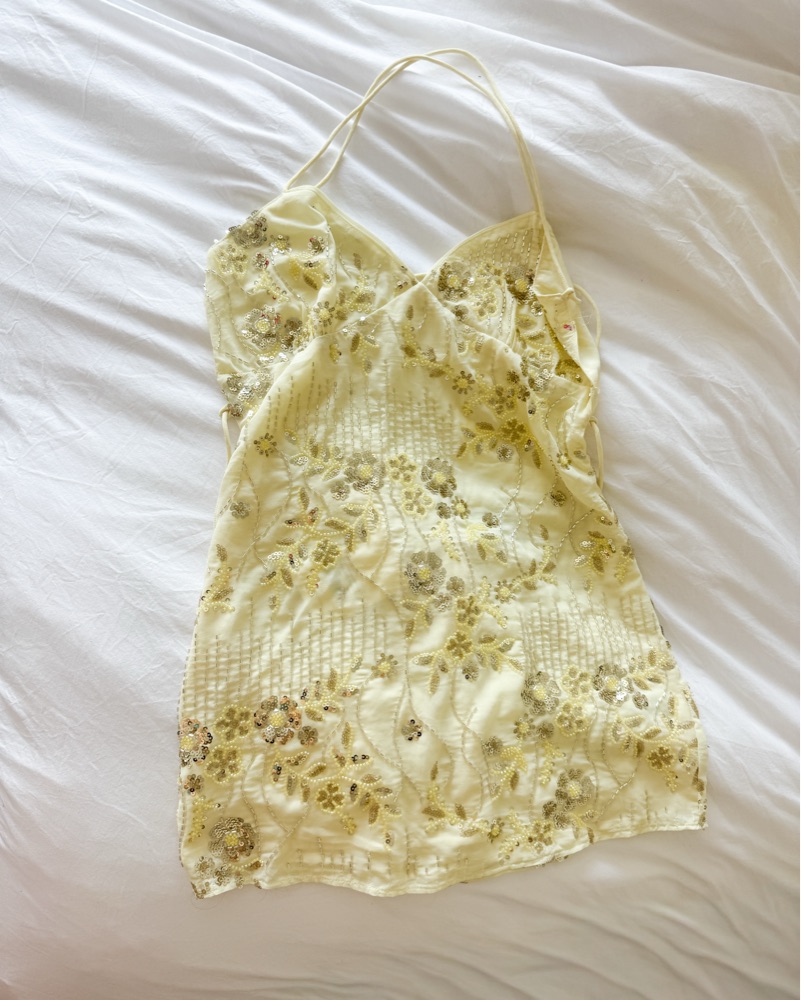 New with tags never worn. Light yellow sequin dress. Adjustable straps - can make the dress shorter or longer by loosening/tightening these straps. Size 6 (fits a small/medium). Perfect for party, birthday, vacation, beach, going out, summer.