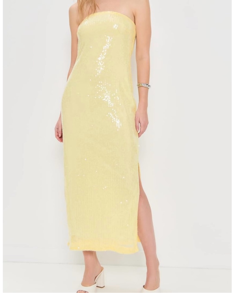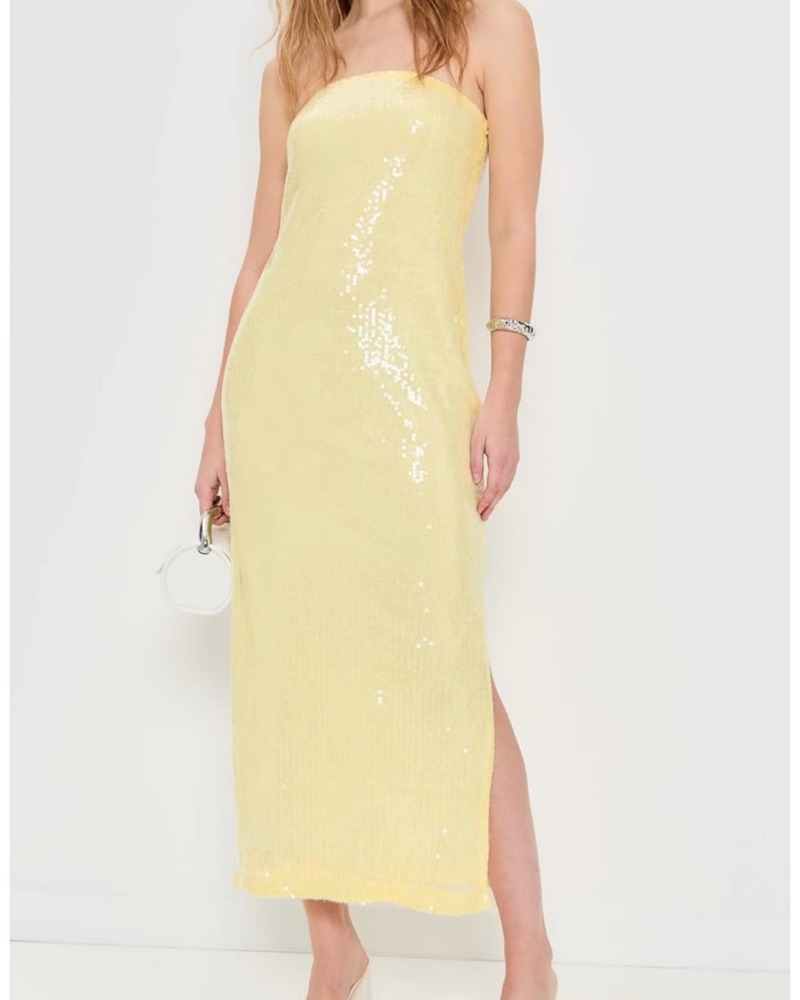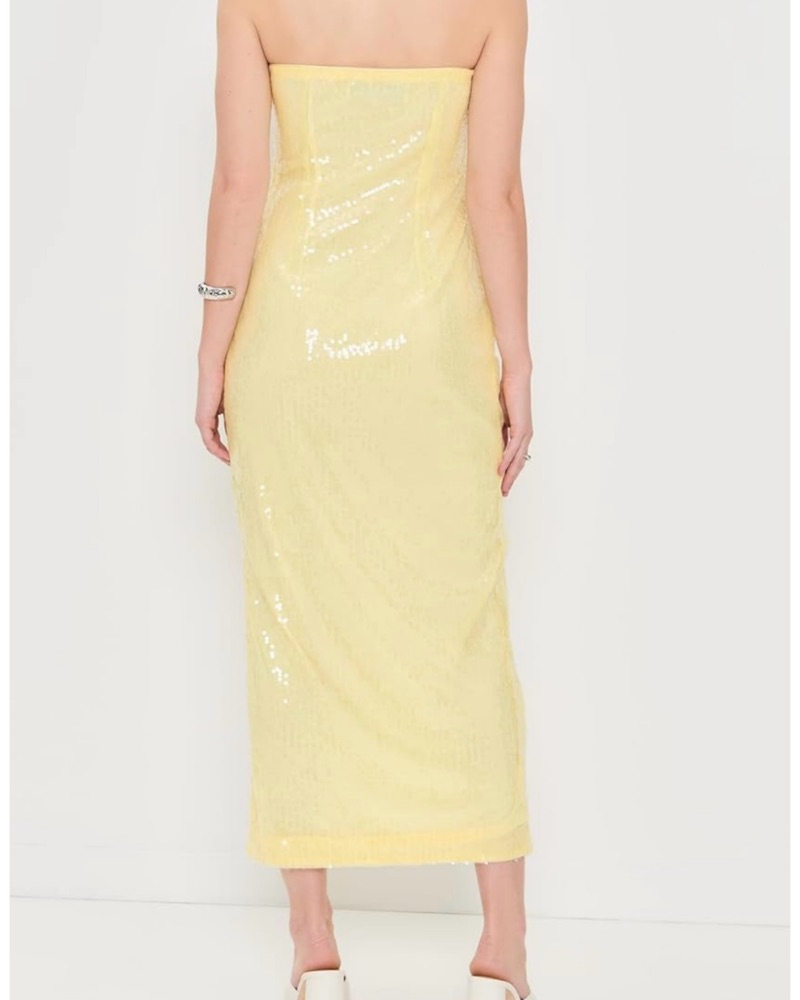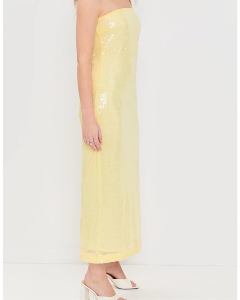 Butter yellow sequin dress that is between midi and maxi (dependent on your height). So cute on and is fitted without stretch.