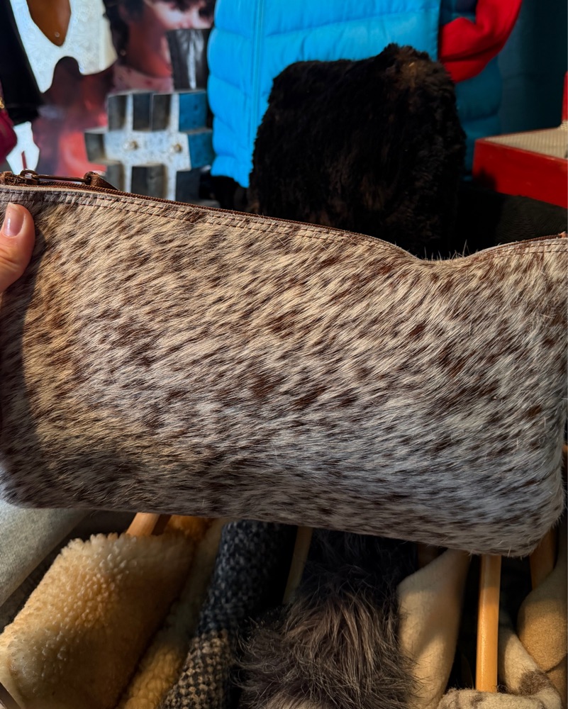 Authentic pony hair & leather clutch with brass hardware. Sooo spacious and perfect for a fall / western wedding