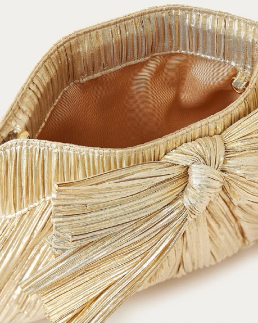 Pleated frame clutch with bow in gold pleated lamé. Fully lined with removable twisted gold metal chain strap.