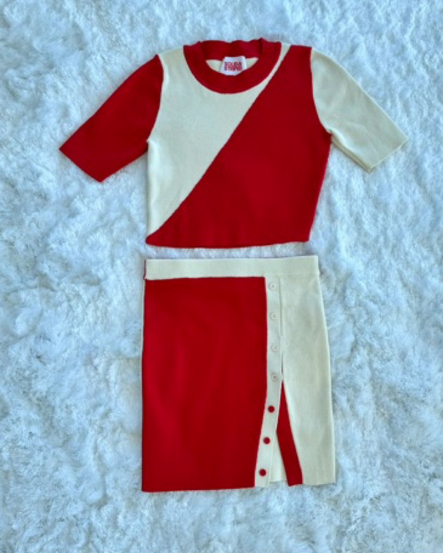 Bold, chic, and effortless— red and cream skirt & crop top knit set from Solid & Striped. New condition. Suitable for many occasions.
