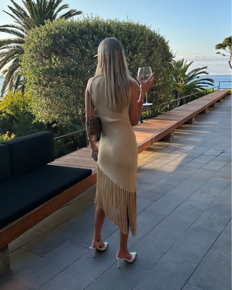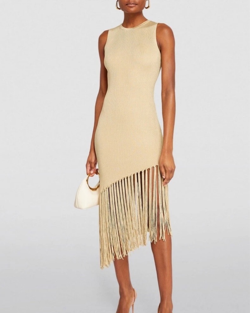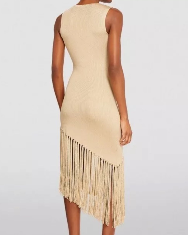 Sandro knit light gold dress with asymmetrical fringe