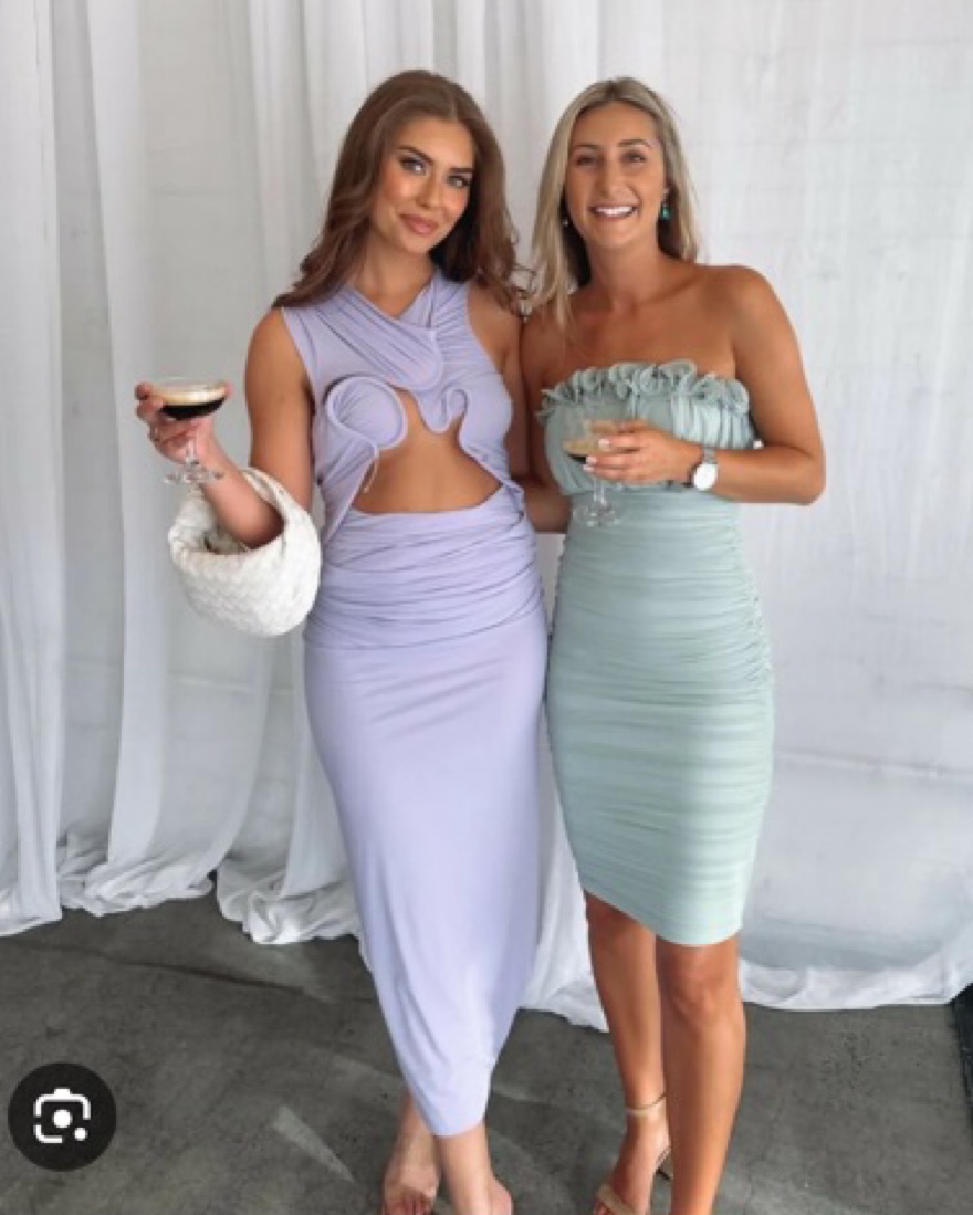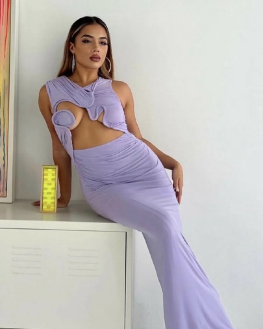 Beautiful lilac dress with mesh top and unique wire scultural cutouts to accentuate the figure. AU size 6 (XS).