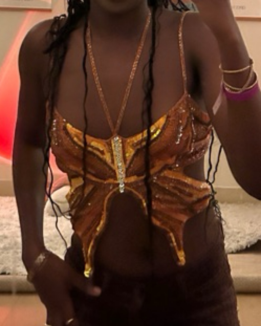 This eye-catching sequin crop top is perfect for a night out dancing or a festival-inspired look.