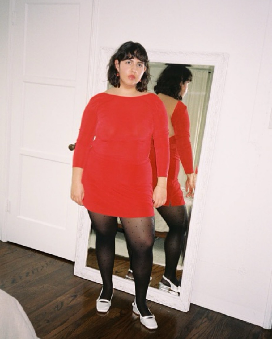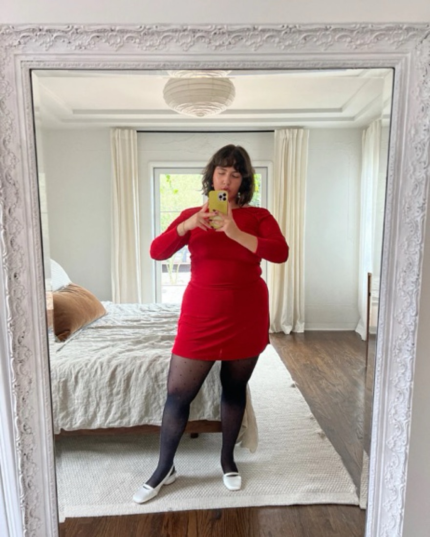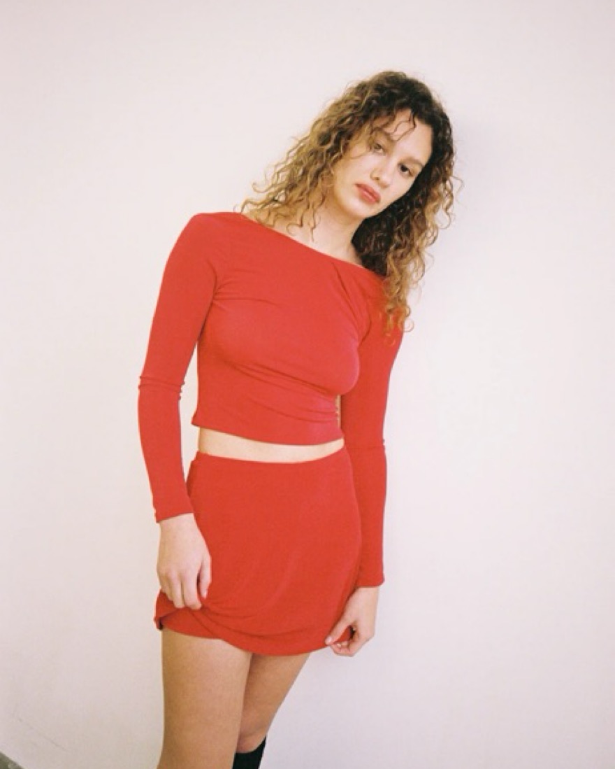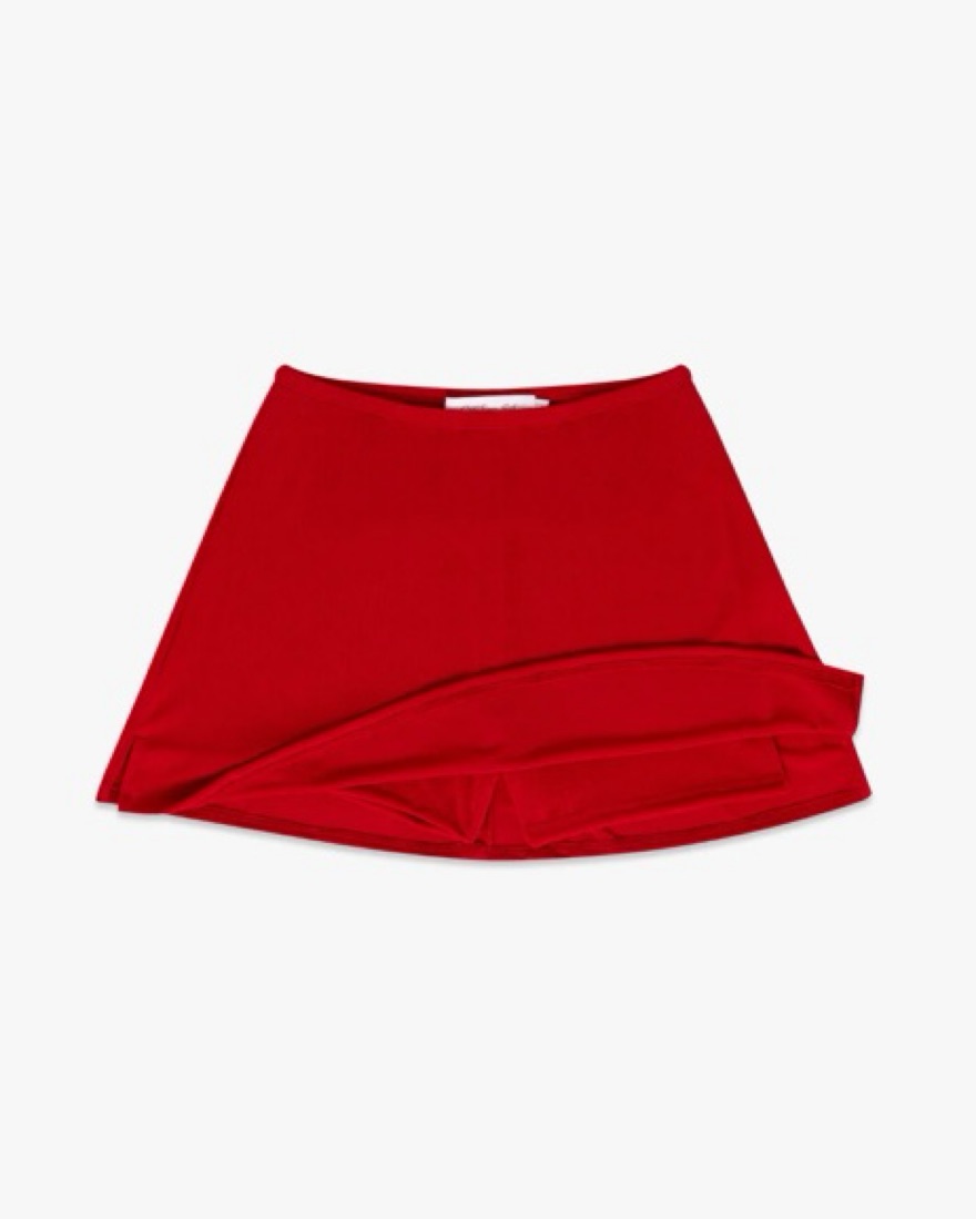 Color is in the brand’s “red slinky.” Cute and comfy! Goes very well with red tights. Size M and with the elastic band you have room to style layers. Brunette model from website is wearing XL, blonde model is wearing a small. Skort length is approximately 14”