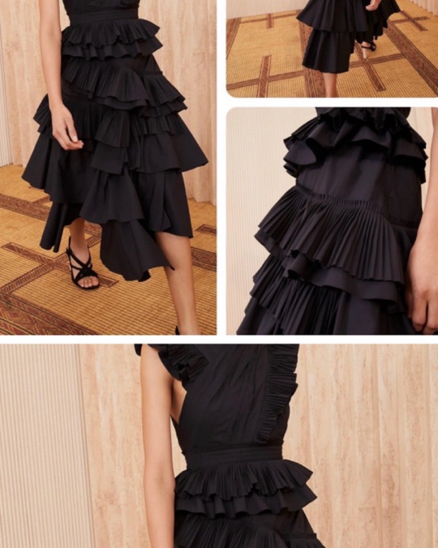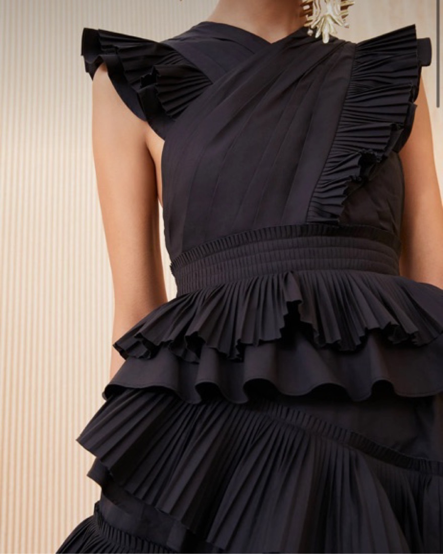 Brand new, wore once to a wedding and got so many compliments! The Aurore Dress is an Ulla Johnson favorite, cut in crisp black poplin. This maximalist midi features layered cascading and pleated ruffles, exquisite crisscrossing neckline, and fixed waist.