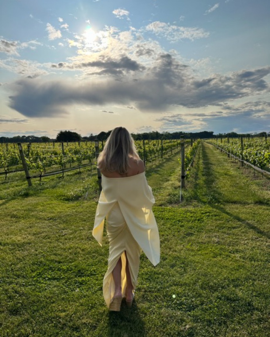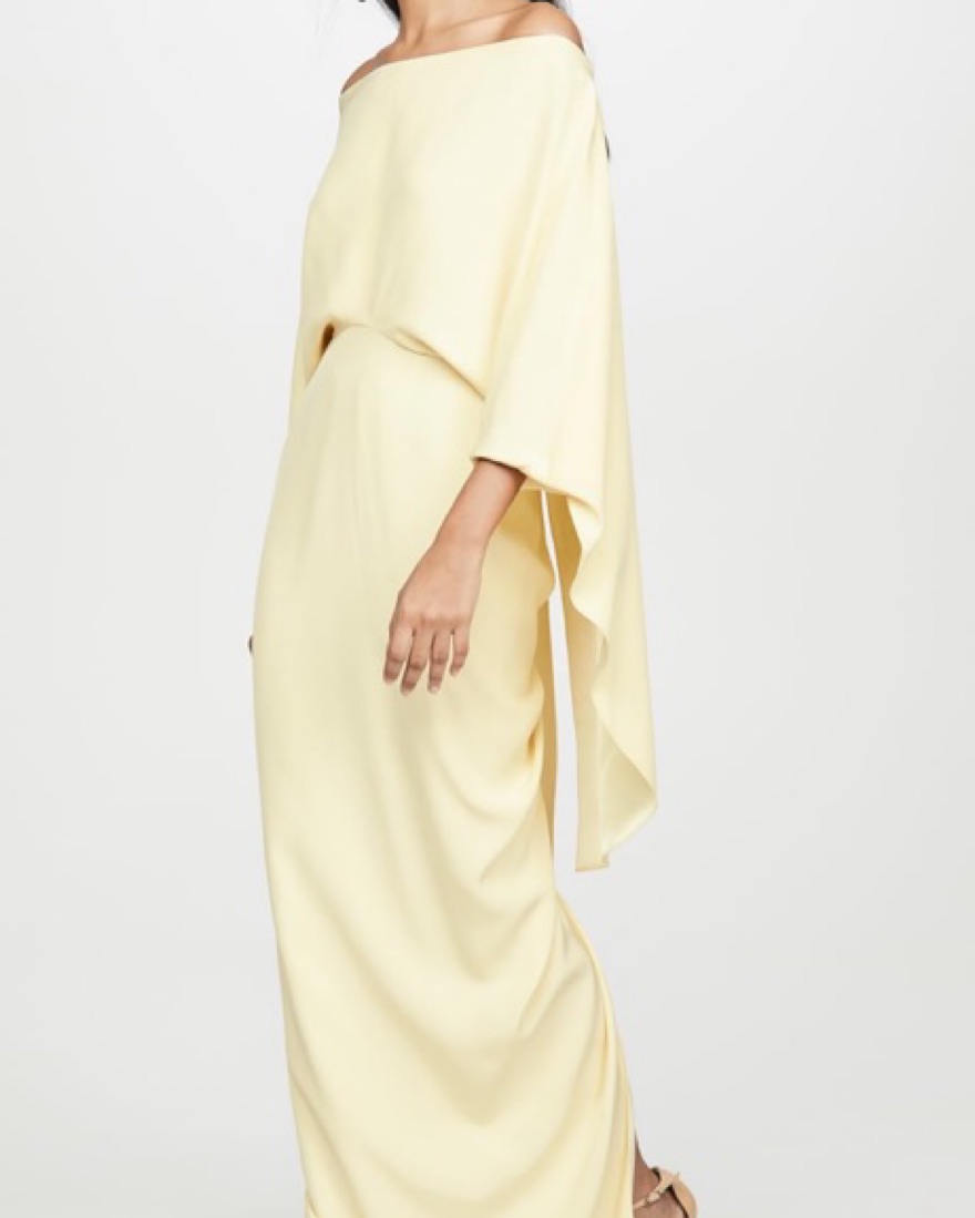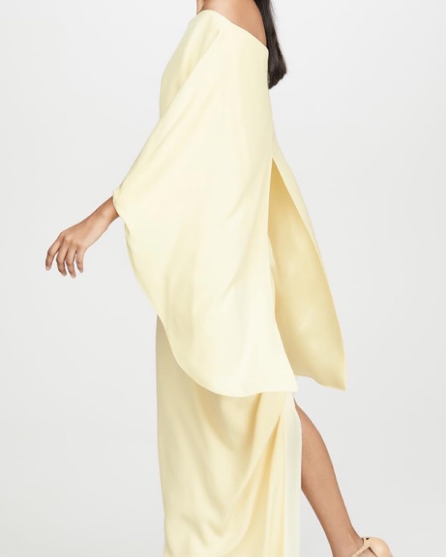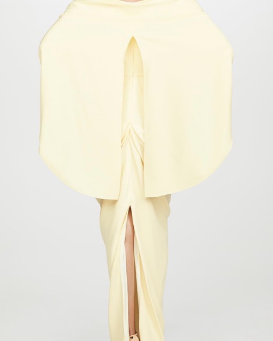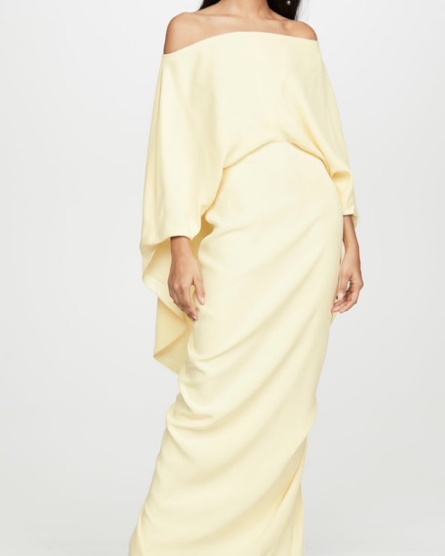 Gorgeous pale yellow, silk, off the shoulder, cape gown. Size 2, fits 0/2. Must be very careful with!