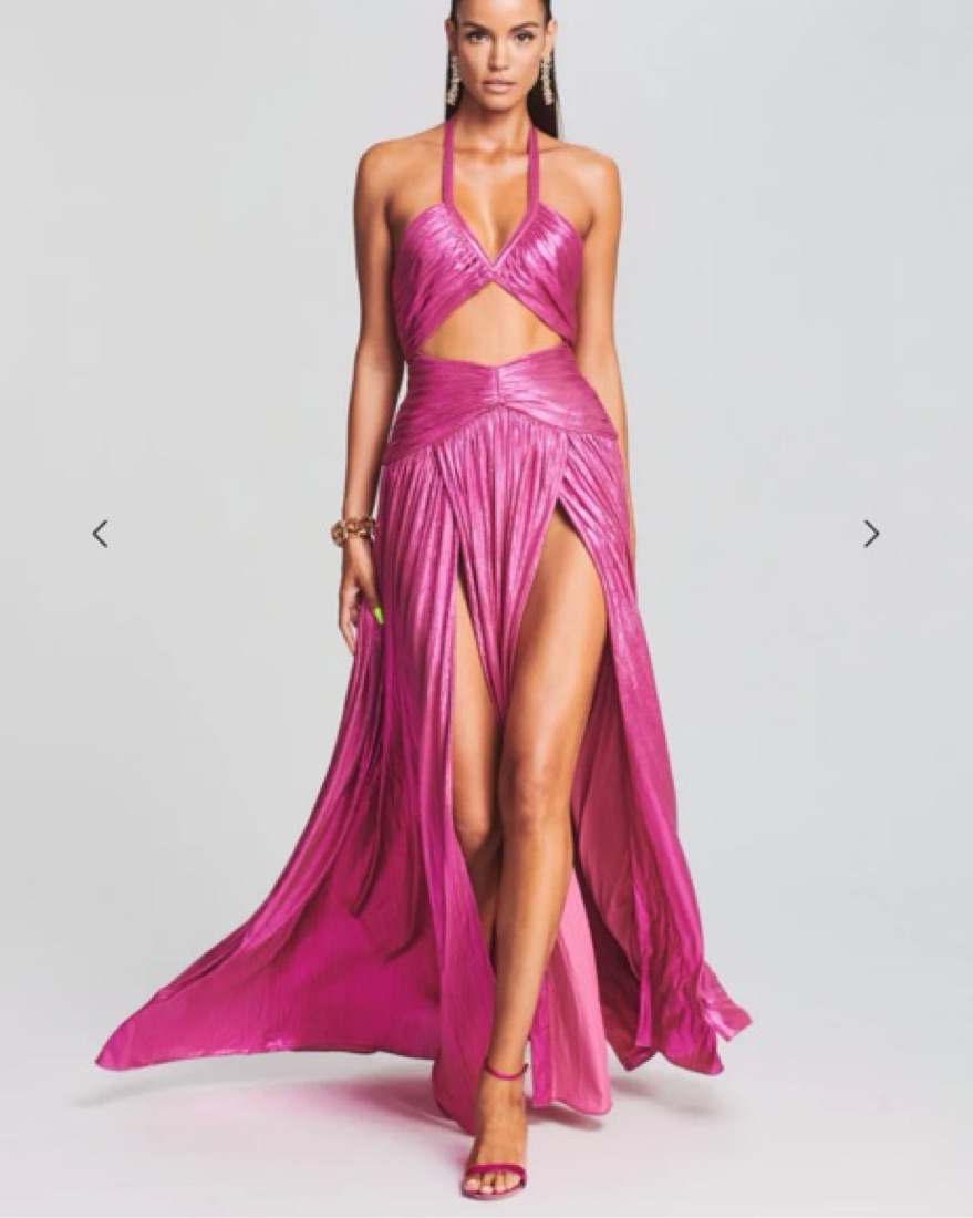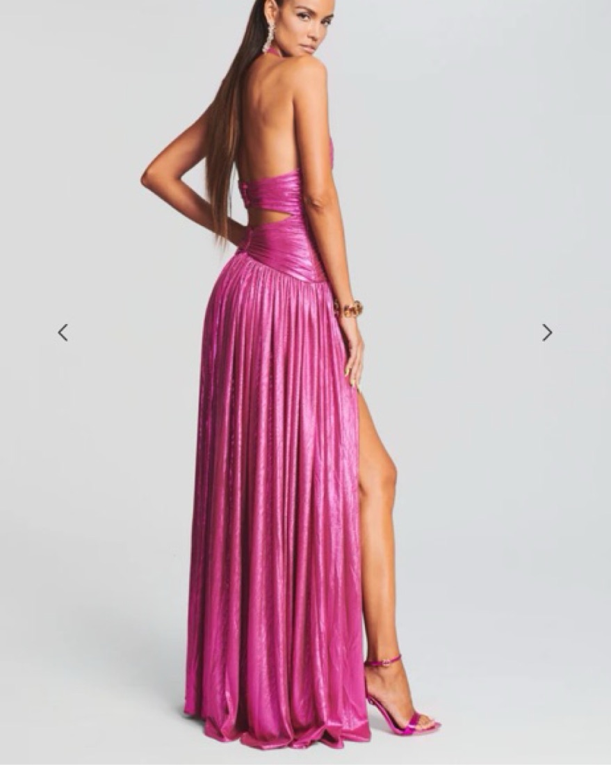a vision of elegance that combines sensuality with sophisticated design. This dress is a statement of bold fashion, featuring dual front slits, a sultry cutout, and a halter neck that captivates attention at every turn. Shown here in Hot Pink.