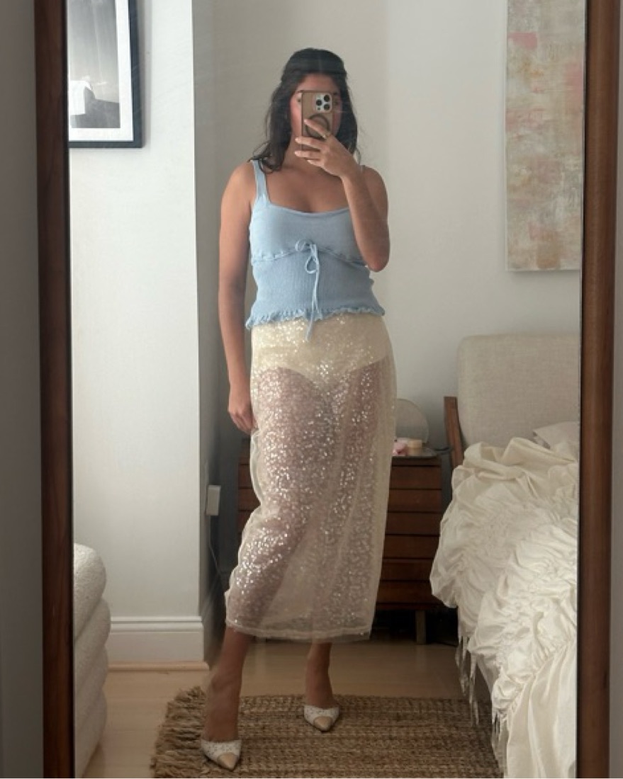 Jason wu cream sequin skirt with built in undies. its 2 layers so there is a sequins layer and a tulle layer but can atill very much see the sequins
