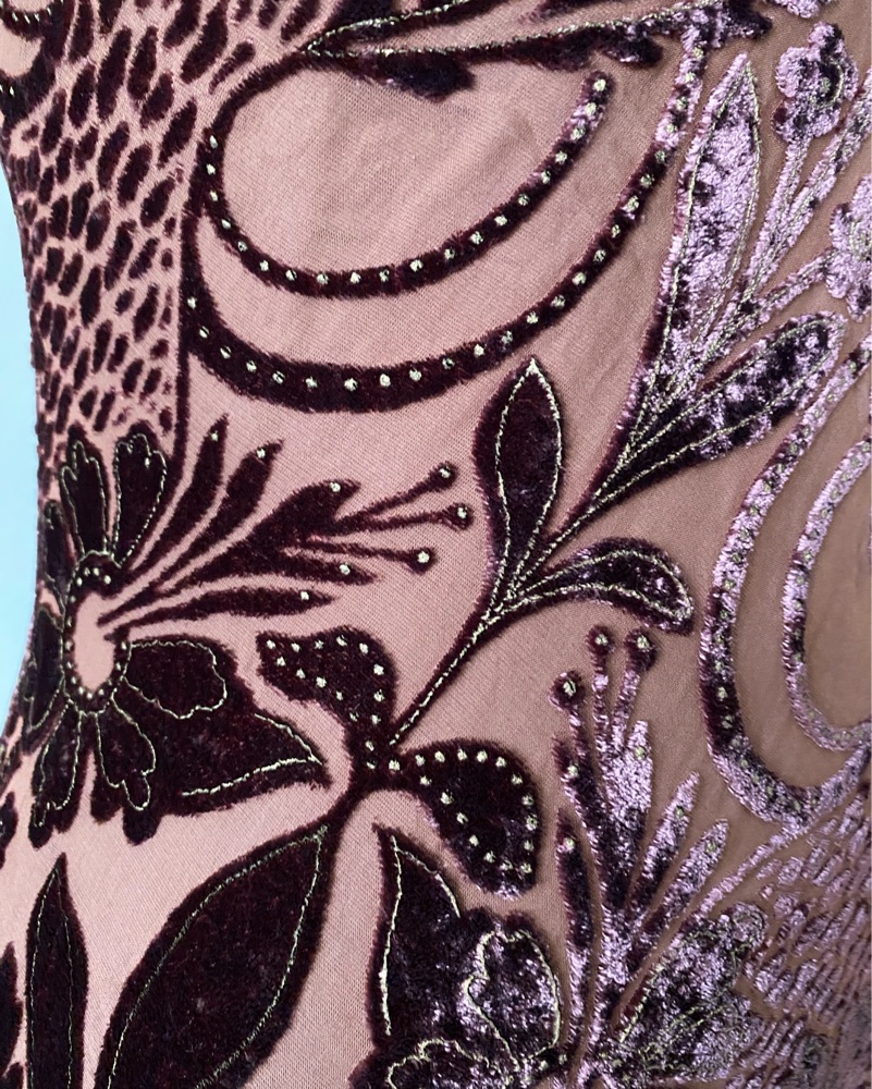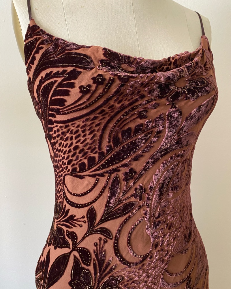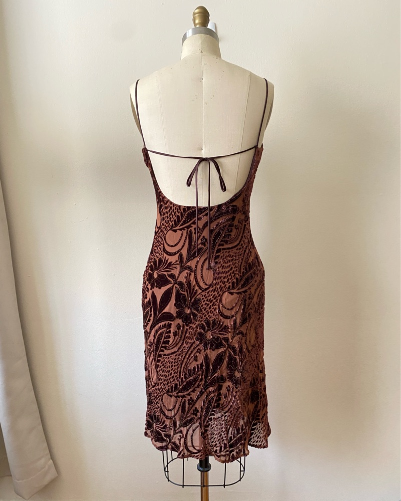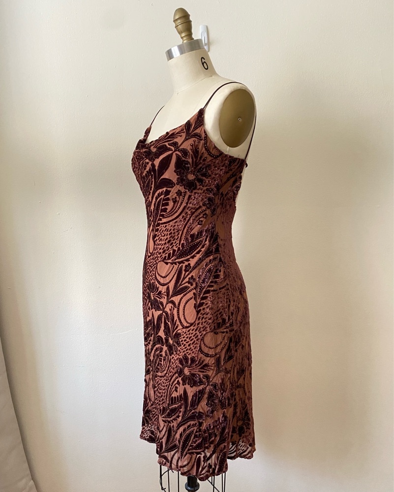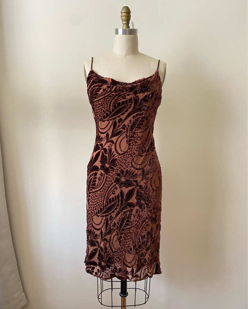 Beautiful deep brown color with velvet burnout and gold metallic details. Silk/Rayon fabric. Total length 40”. Size 4 Petite. Great condition. This dress has been laundered. No perfume on dress, no self tanner/glitter.