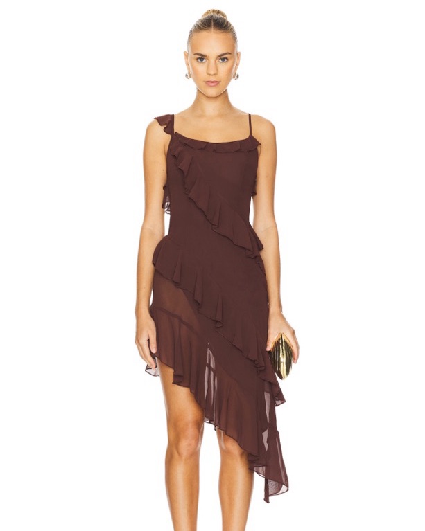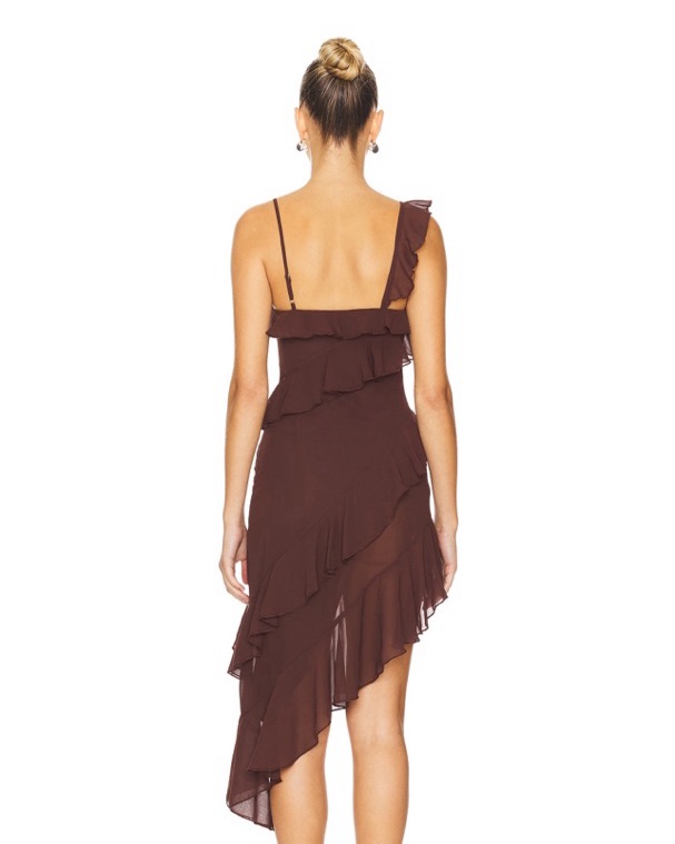 Self: 100% polyester Lining: 95% polyester, 5% elastane Fully lined Hidden side zipper closure Adjustable shoulder strap Chiffon fabric with tiered-ruffle accent and asymmetric hem