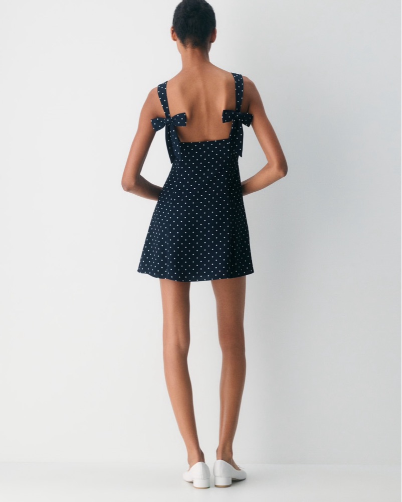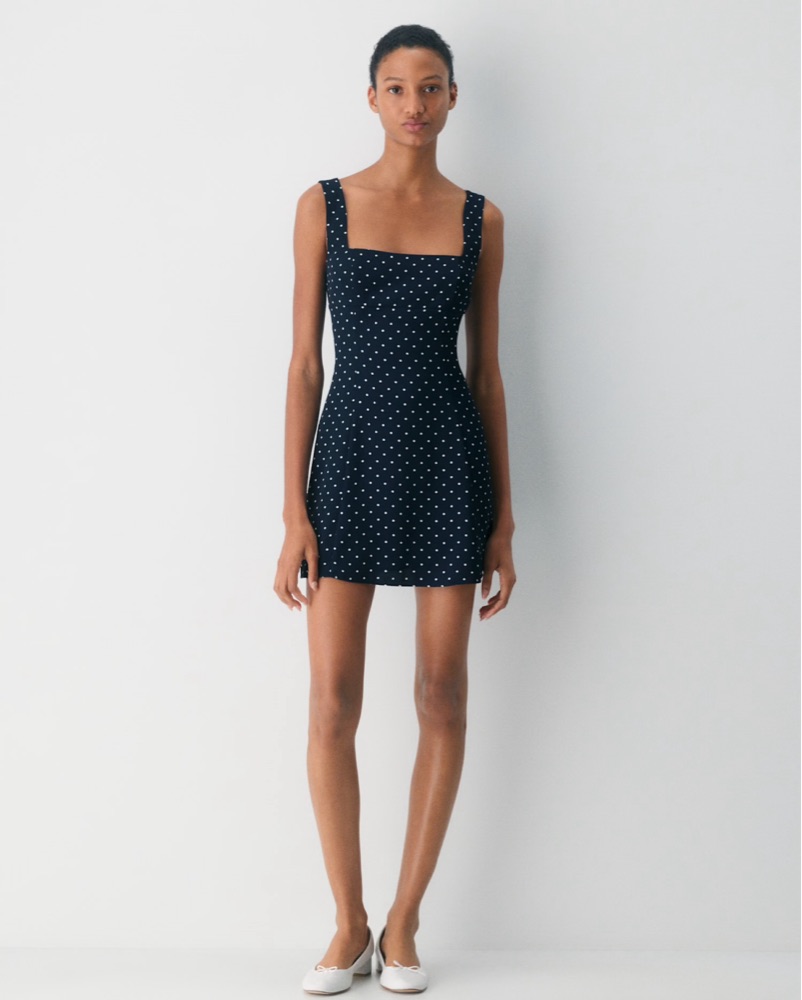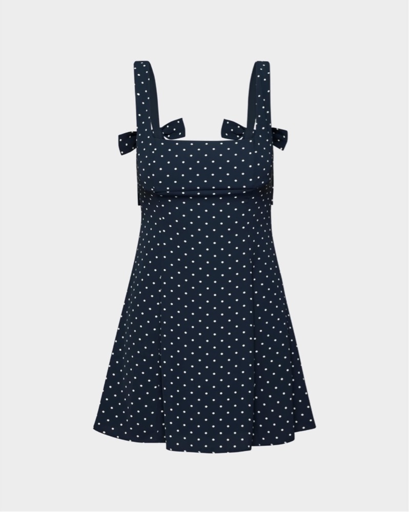 this aritzia dollop dress is navy with polka dots in a size 4, and it is a sleeveless fit-and-flare dress with a square neckline and princess seams for shaping. dress is in like new condition! pickup available by penn station