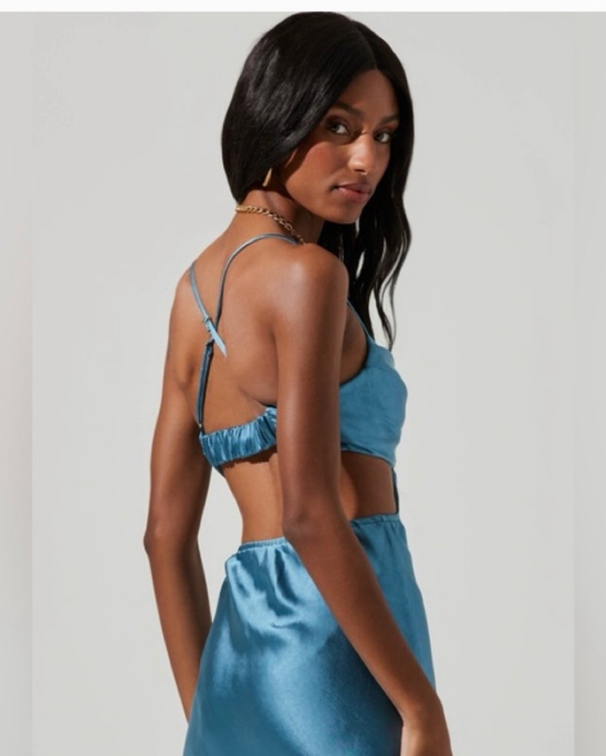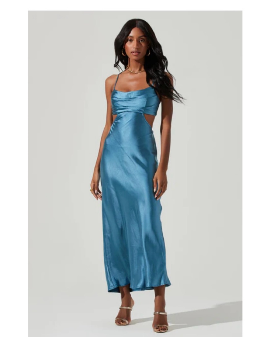This captivating satin midi dress is perfect for a glamorous night out. The elegant blue hue and figure-flattering silhouette will have you feeling confident and chic.