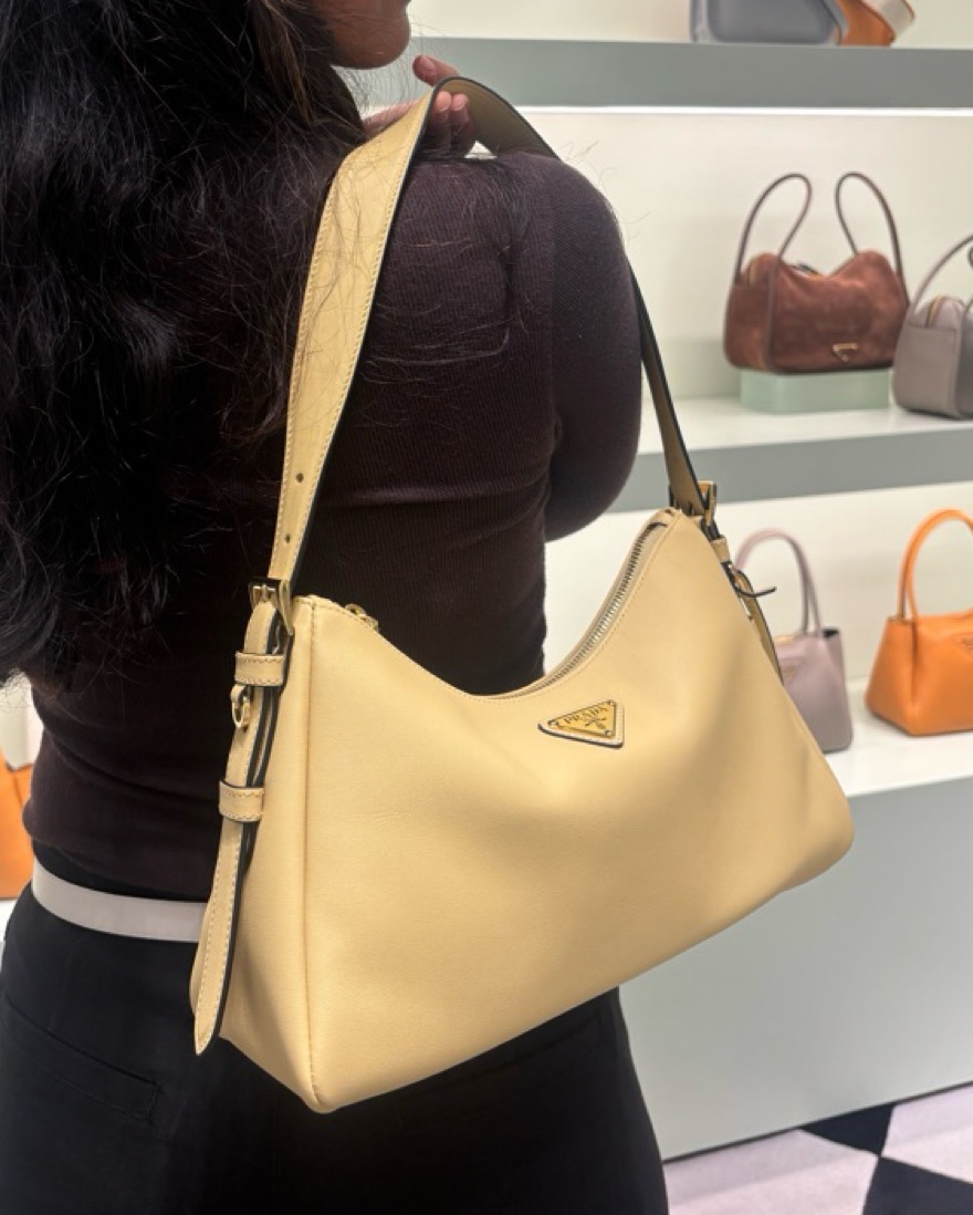 Just got this from Italy a couple months ago!! I have never seen this color in the US stores. It’s like a light butter yellow or vanilla color. Not as bright yellow as it seems in the first pic. Perfect for a spring / summer day. Medium size. It’s lambskin soft leather so please be super careful :)