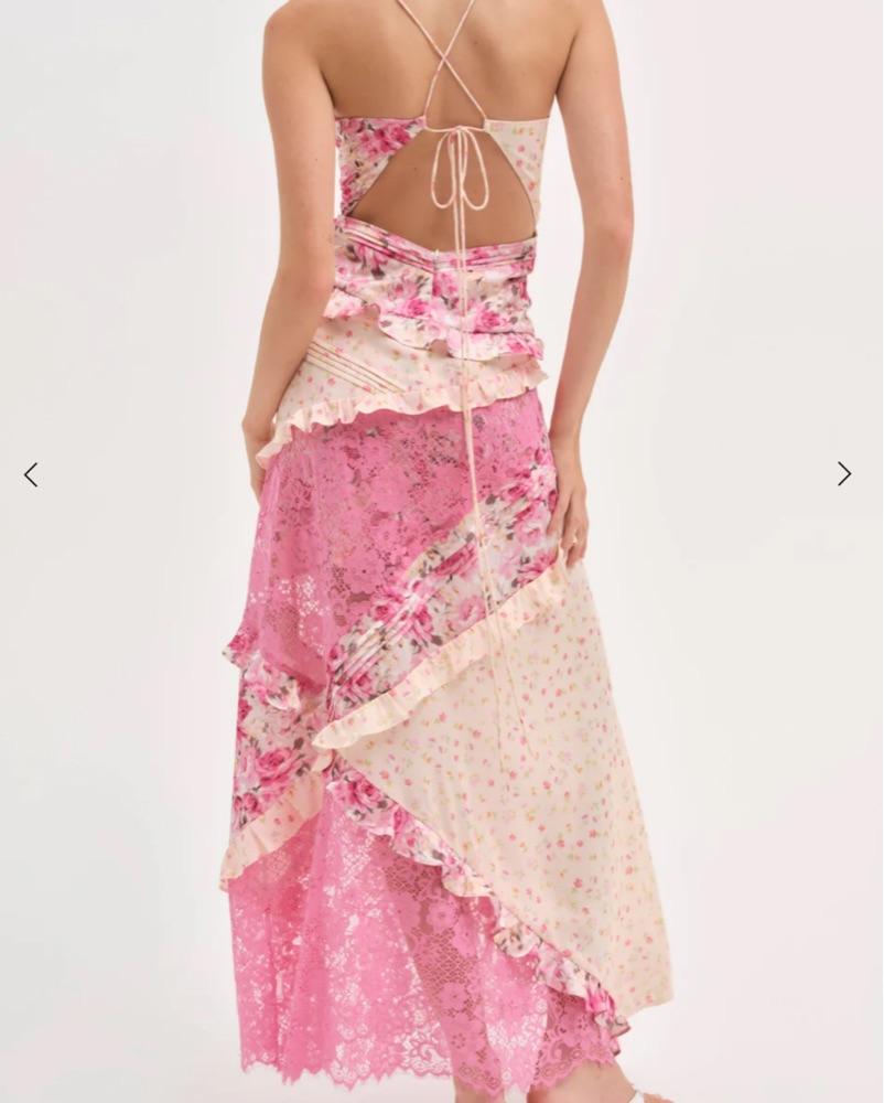 A bestselling maxi dress silhouette—the Rosalyn floral maxi dress is back in a romantic coral and patchwork design. Inspired by '70s dresses, the Rosalyn patchwork dress has a plunging neckline and features mixed print paneling and floral lace with ruffle details throughout.