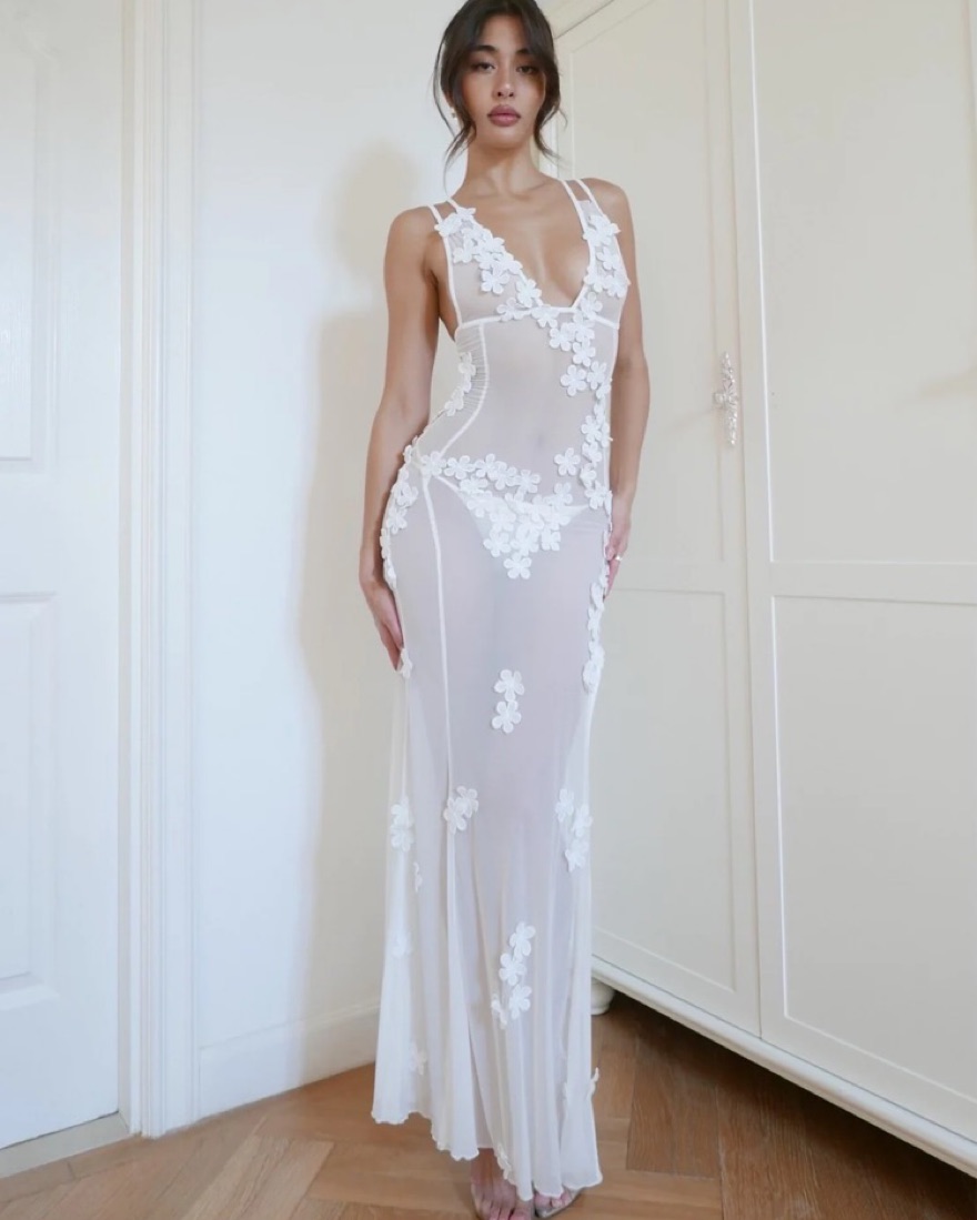 Fits more like XS. Must be returned in perfect condition or fees will apply, no self tanner or body makeup. Must wear a liner with the underwear. A sheer, maxi dress in white, hand finished with delicate flowers. Low neck, high slits with double straps, cut to a chic hourglass silhouette.