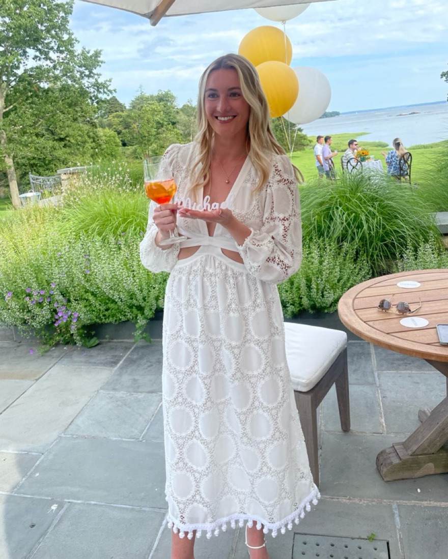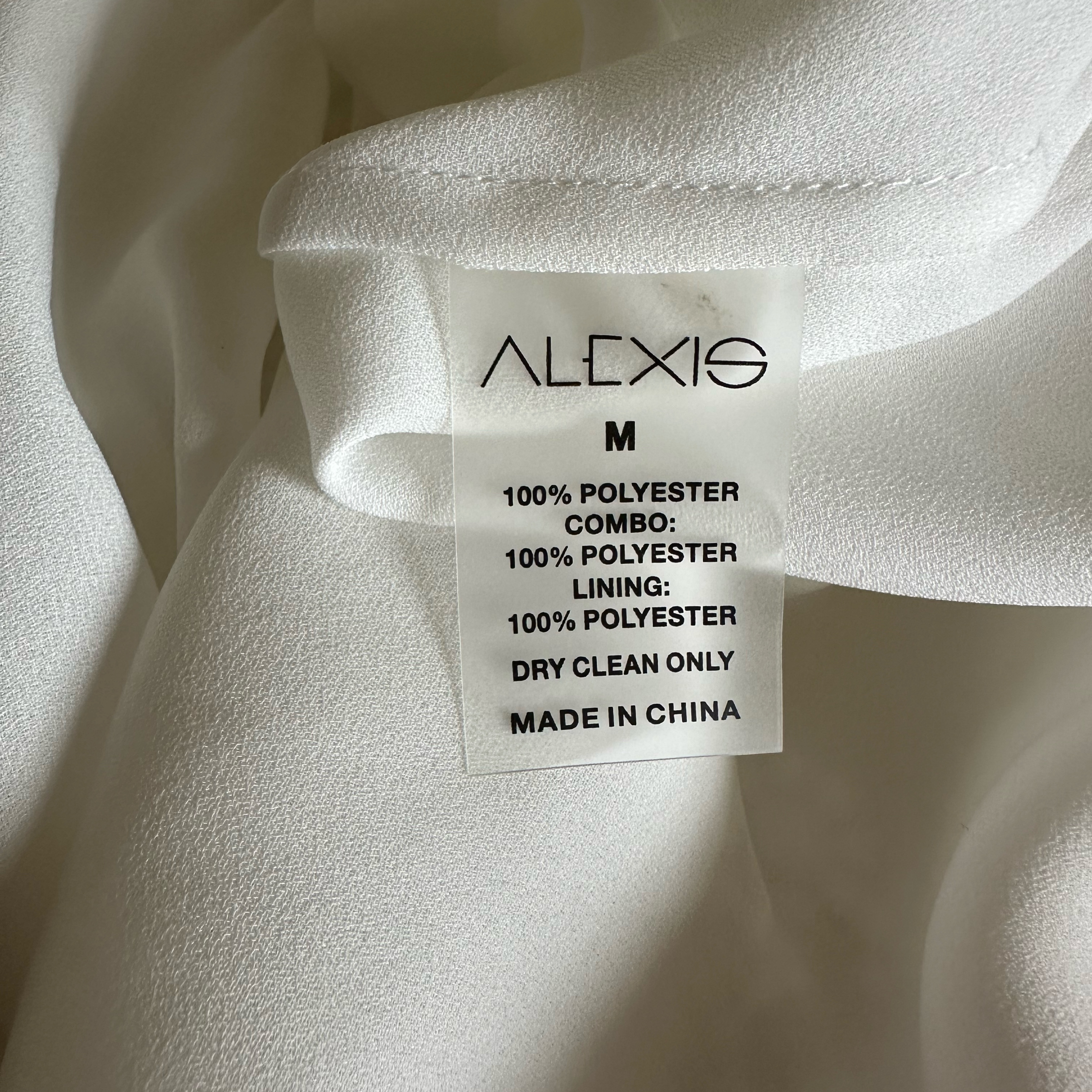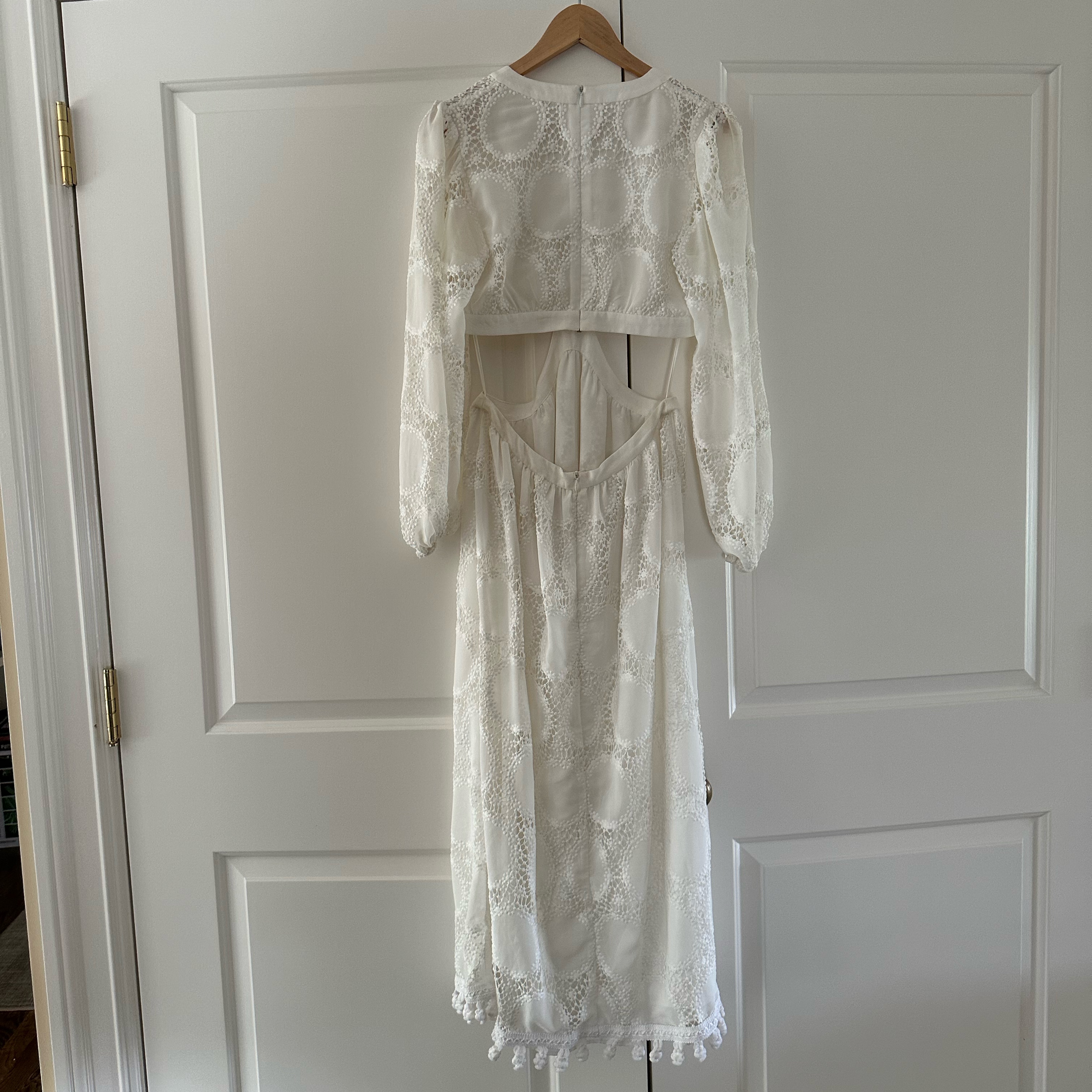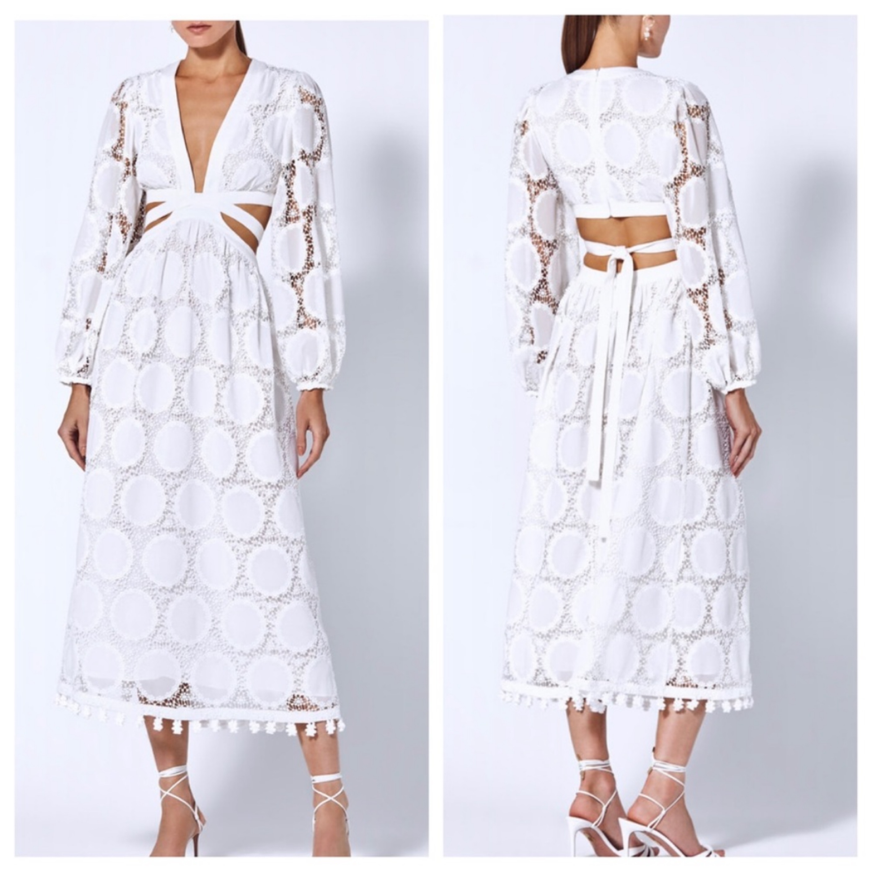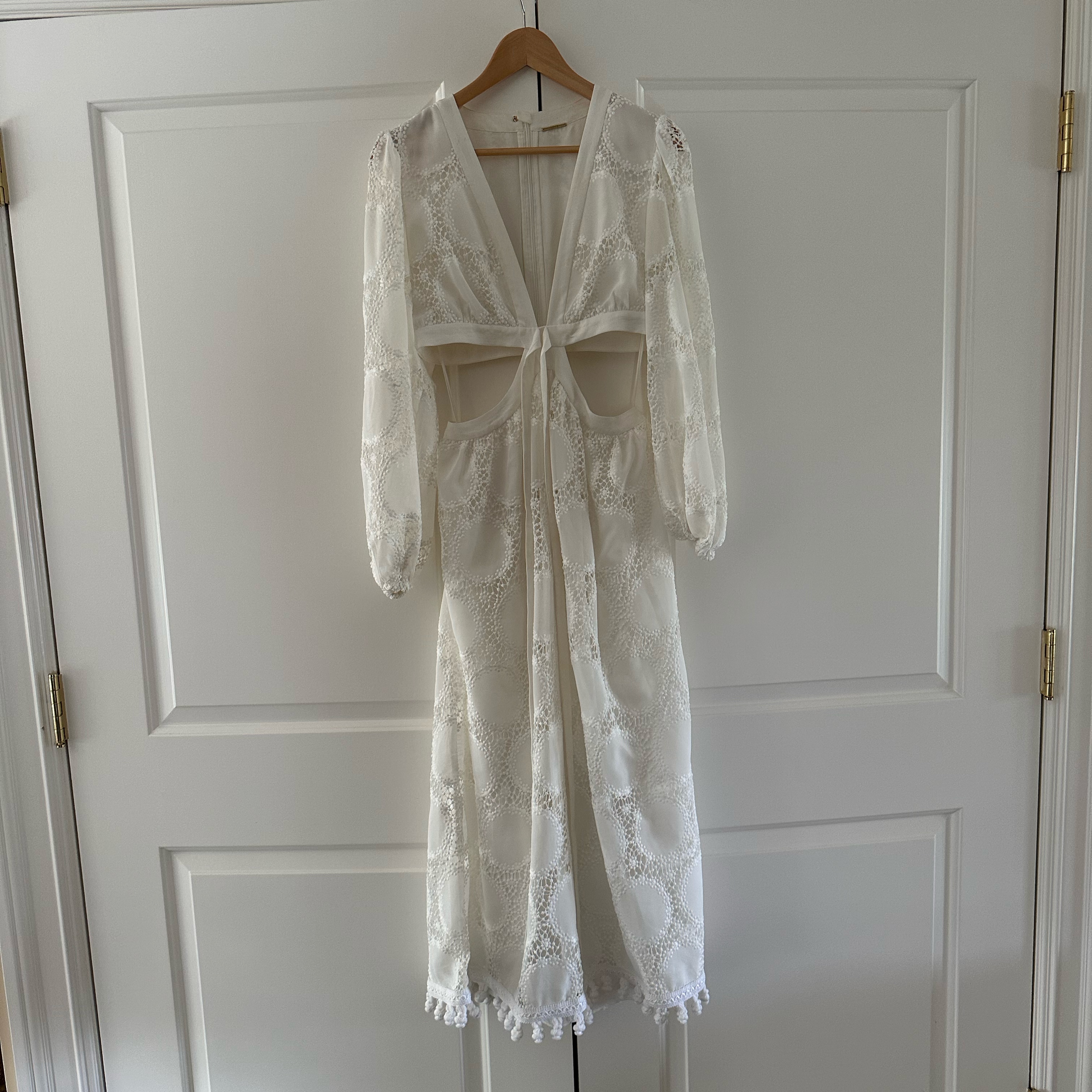 Alexis Women's Size M Stran Lace White Midi Open Tie-back Dress. Dress features a plunging V-neck, long sleeves, and a cutout waist with a tie. Perfect for anything bridal related! Worn once and true to size.