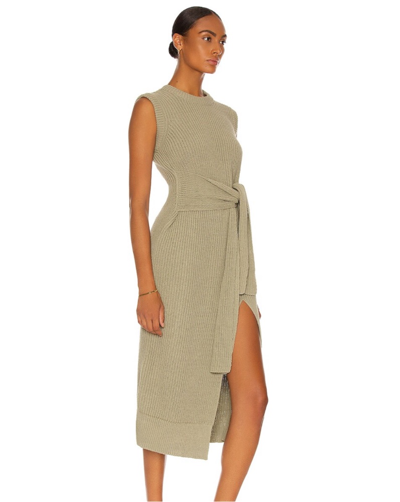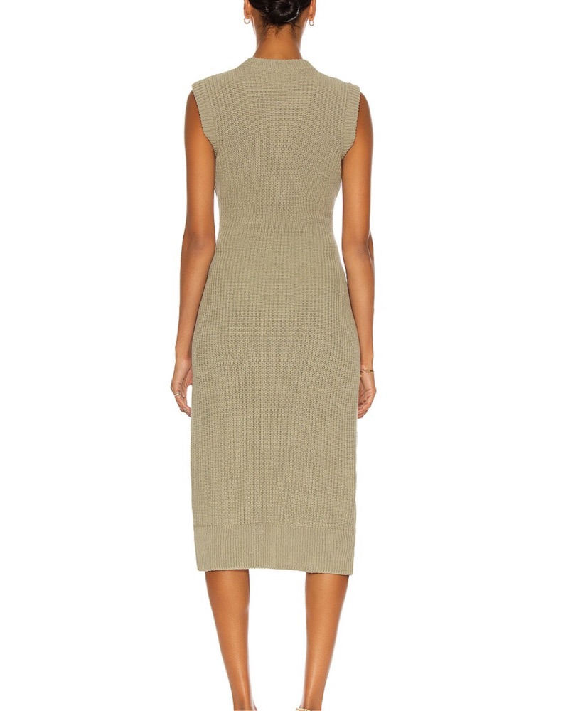 This sage green sleek ribbed knit midi dress exudes modern sophistication. Its timeless silhouette and neutral tone make it a versatile choice for a variety of occasions. I am 5’4” and it comes down to my ankles