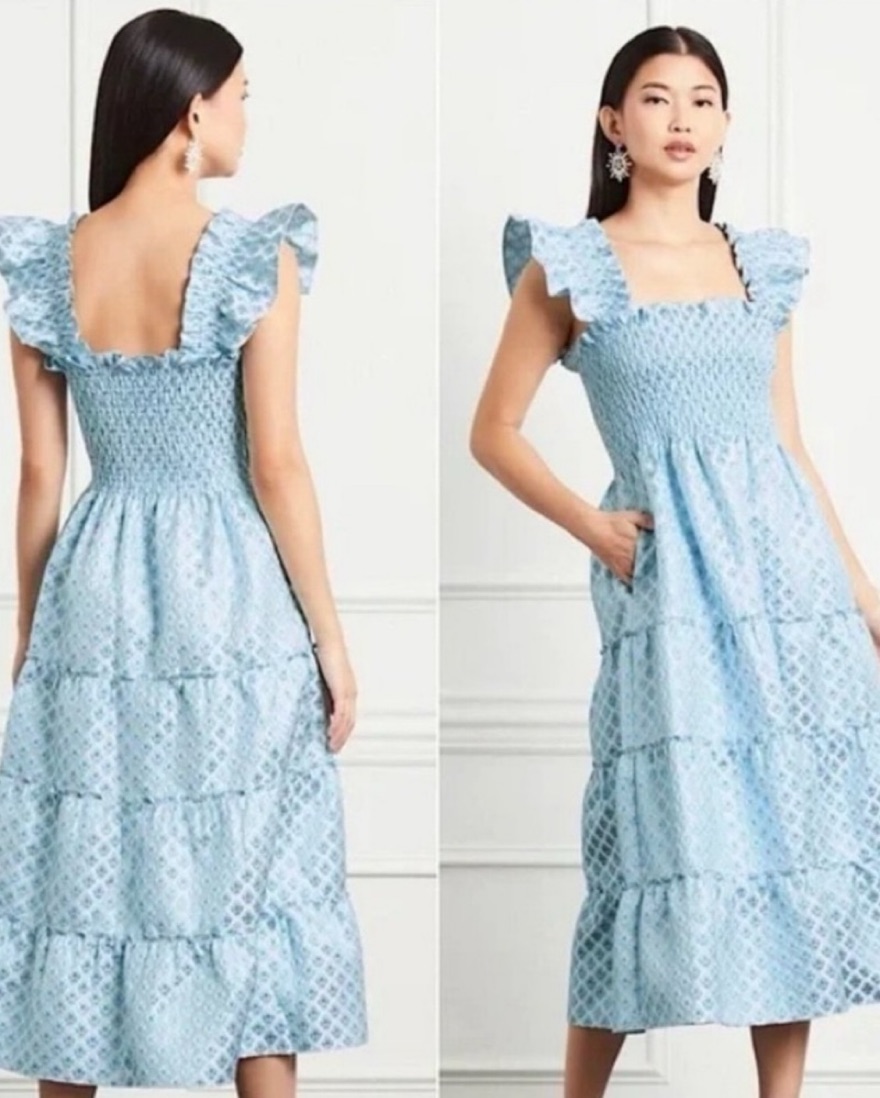 The Ellie is an A-line Nap Dress® with elasticated smocking, ruffled shoulders, tiered midi skirt, and pockets. In the Snowflake Brocade fabric. Blue jacquard (82% Polyester, 18% Metallic)