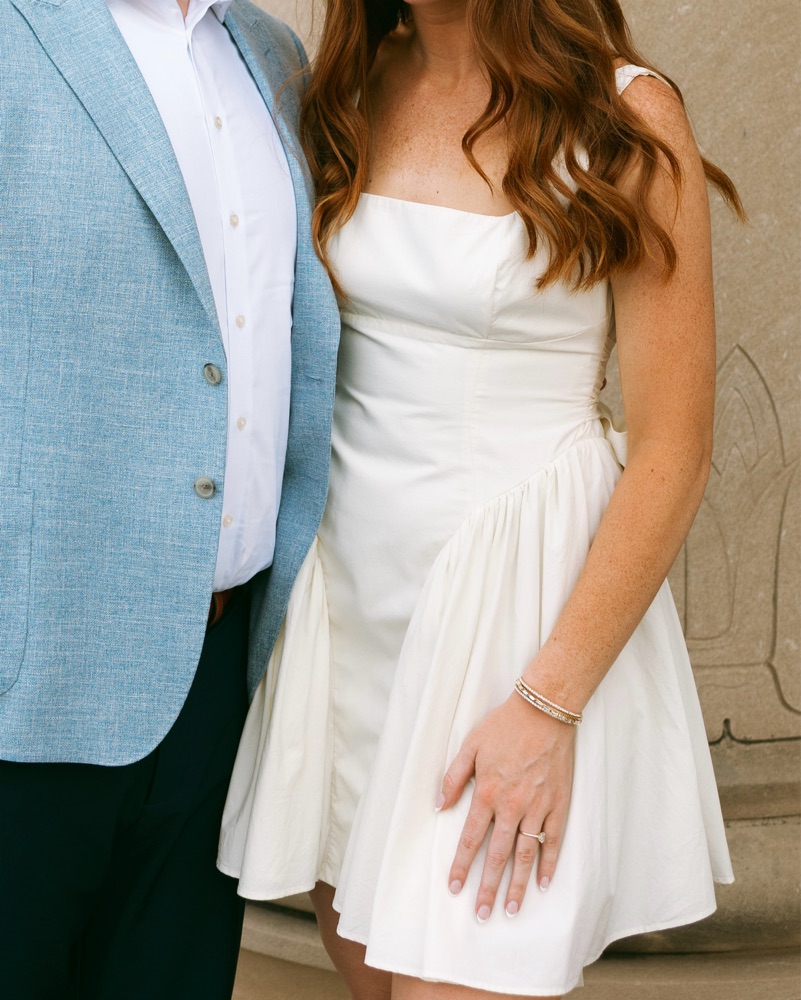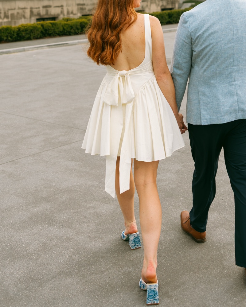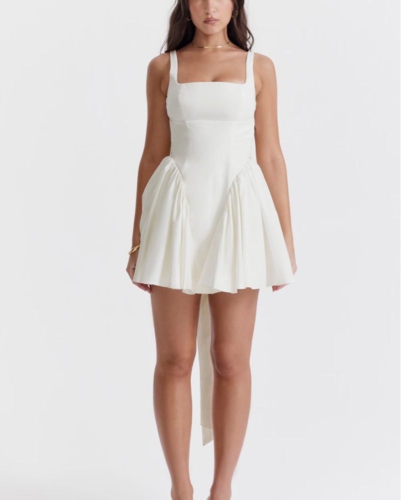 This chic white mini dress is perfect for a special occasion. The flowing skirt and bow detail on the back add a touch of femininity. Some tanner stains on the inside but perfect condition on the outside. Size L with 2in of extra length, perfect for tall girls.