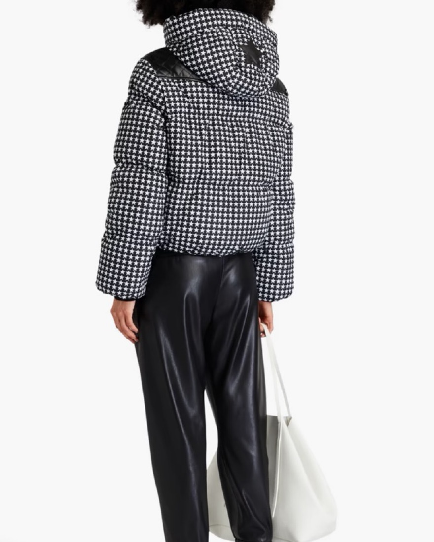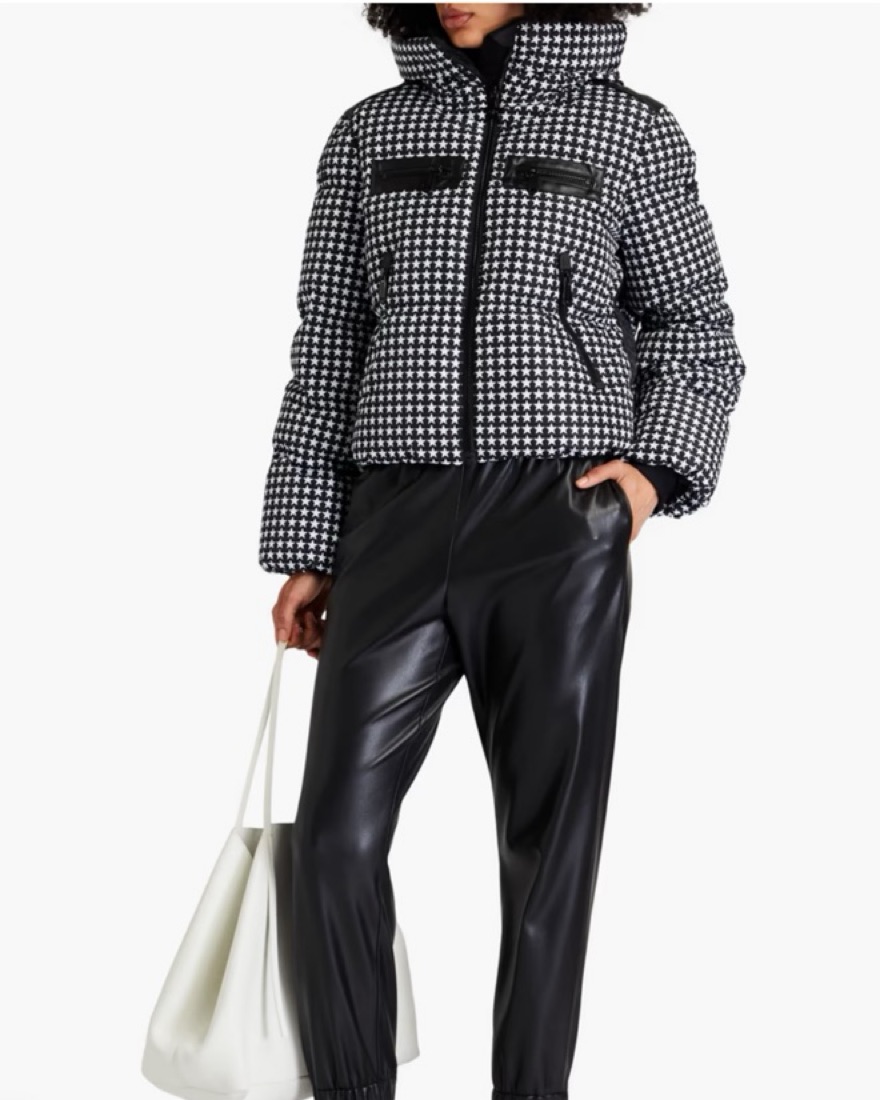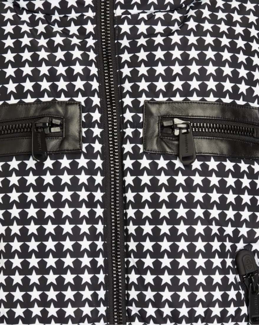 Look fabulous on and off the slopes in Tyne Goldbergh quilted printed hooded down ski jacket. Featuring a detachable snow skirt, drawstring hood and faux leather trim.