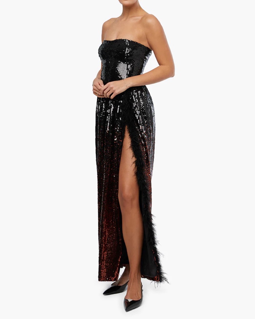 Brand new sequin gown with feathered high slit- Great for special events!