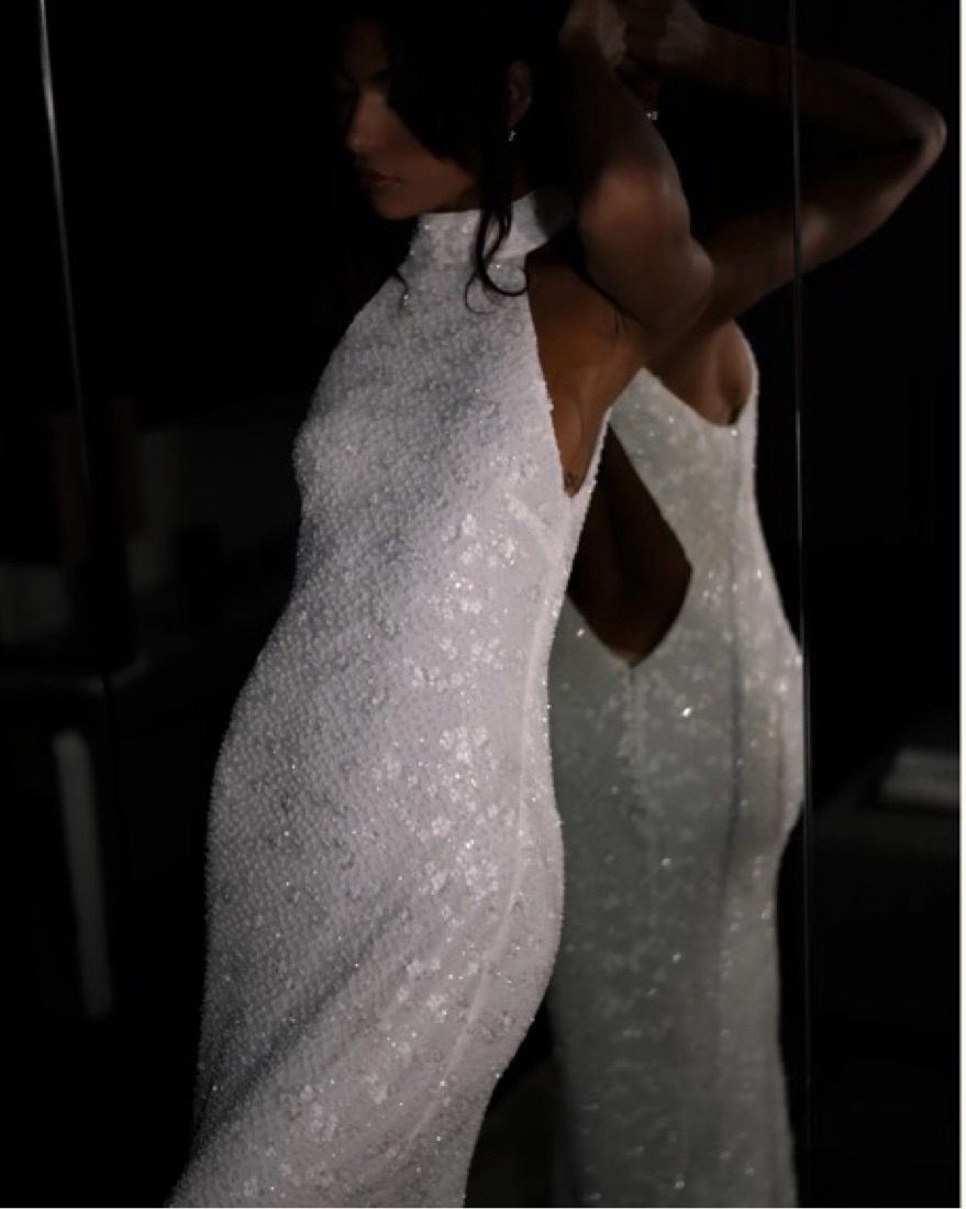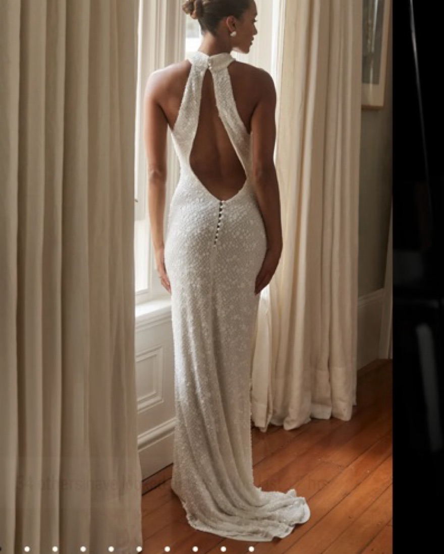 Gorgeous dress size xxs, length altered to fit 5’5 sweeping the floor. Would fit someone in a size 0/2 best but it does have lots of stretch