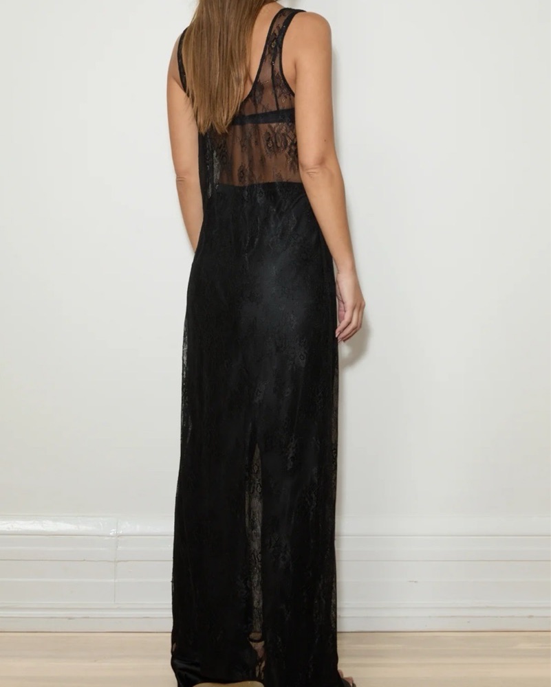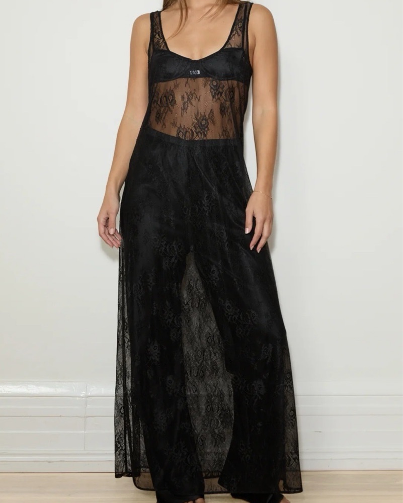Ethereal and alluring - this lace maxi dress features a scoop neckline and sheer detailing that trace the body’s silhouette, creating a balance of elegance and subtle sensuality