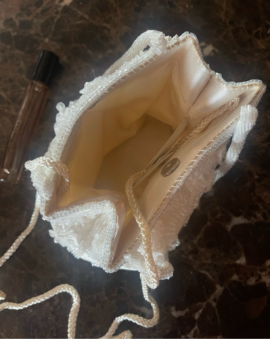 Beautiful, feminine white beading with floral tool accents. Dainty tassel. Would pair well for gala, prom, formal events. Extension strap. Phones 5.4” or smaller can fit