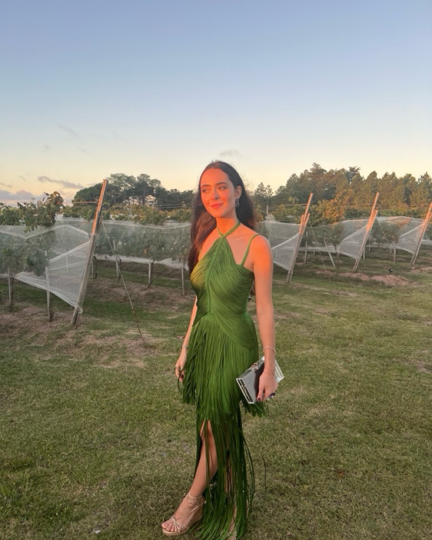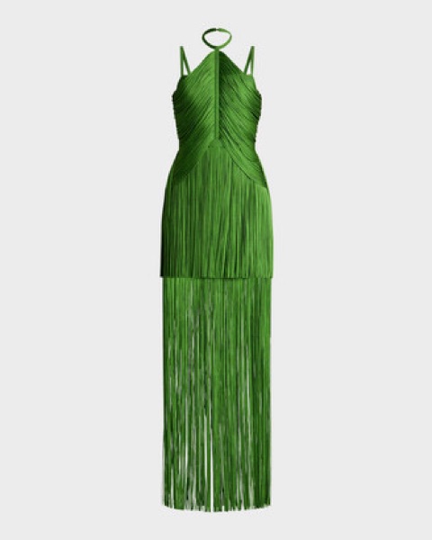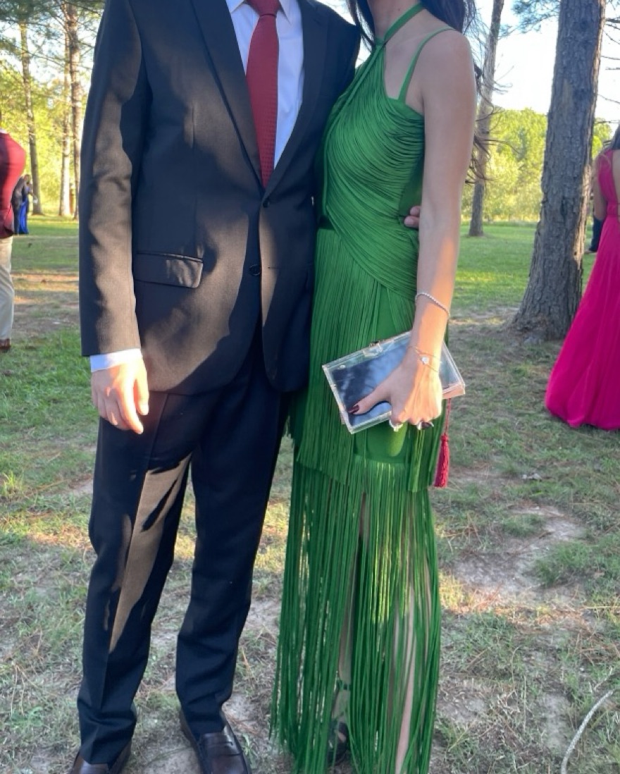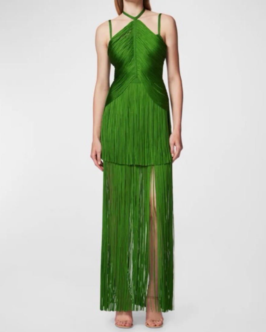 This stunning green dress is perfect for a special occasion, a wedding or cocktail party. The flowing fringe details create a captivating and sophisticated look. Fits true to size, but because of the bandage fabric, can fit a S as well
