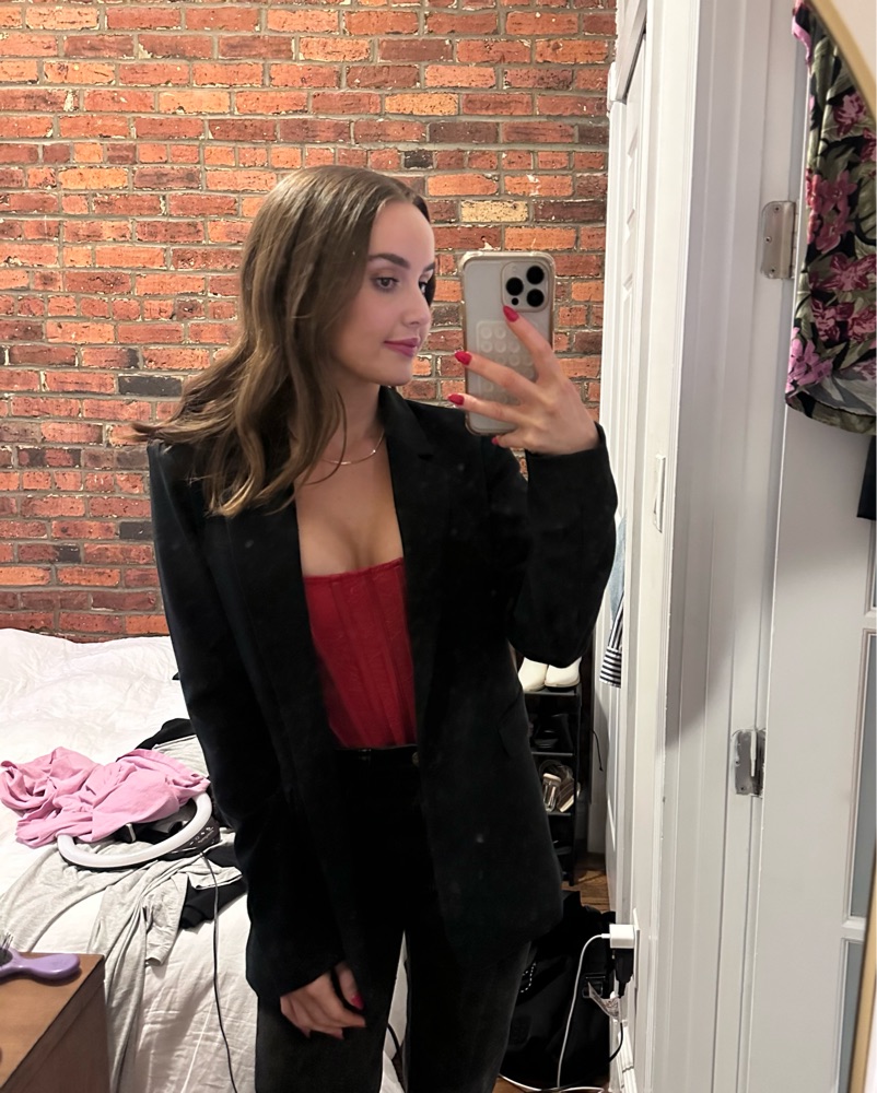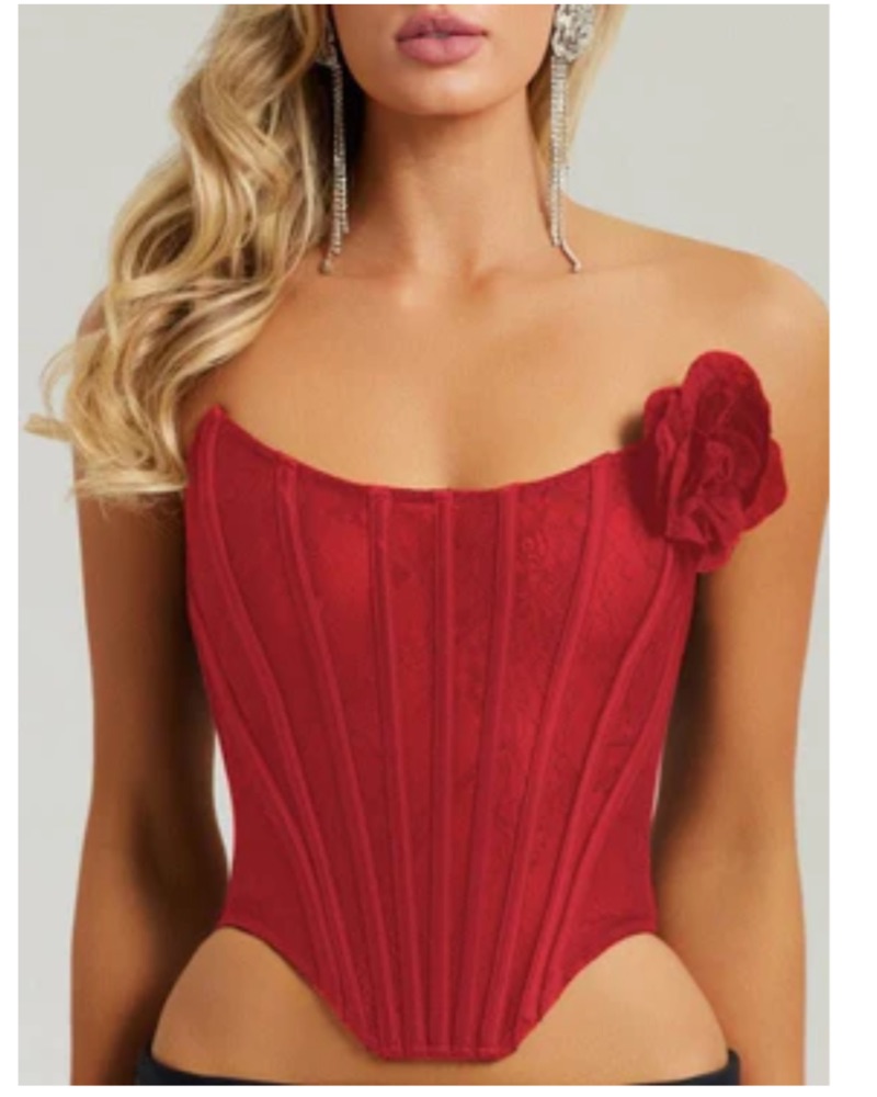 This chic red bodysuit is perfect for a night out or special occasion. The structured bodice and dramatic floral accent add a touch of glamour.