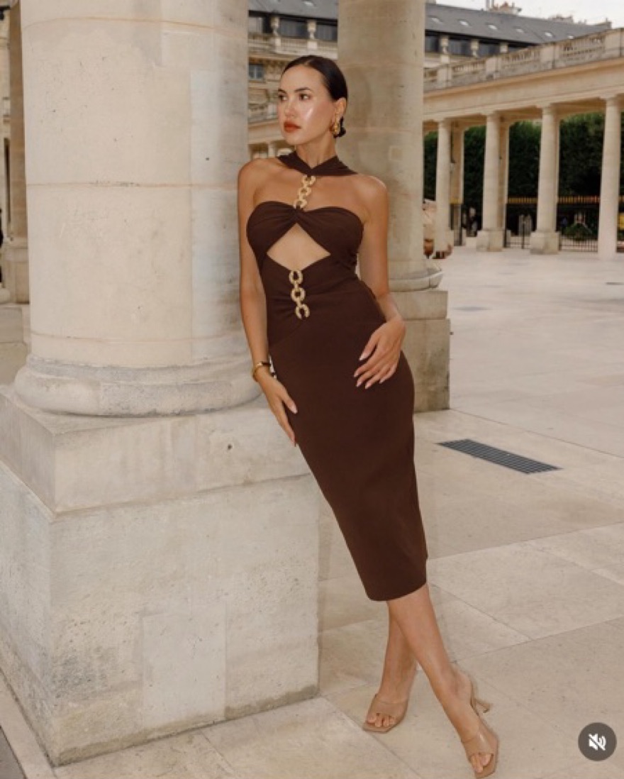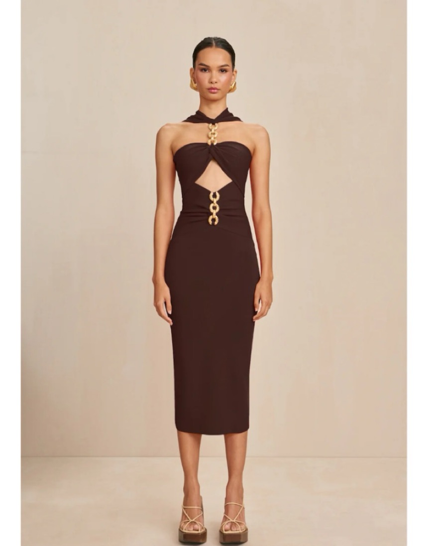 The most flattering dress! Tags: brown dress, chocolate brown, midi dress, cult Gaia dress, bachelorette dress, arcina ori, cult gaia, semi formal dress, vacation dress, manning cartell, alexis, espresso martini, jungle, cocktail party, espresso martini theme, cocktail dress, chocolate brown