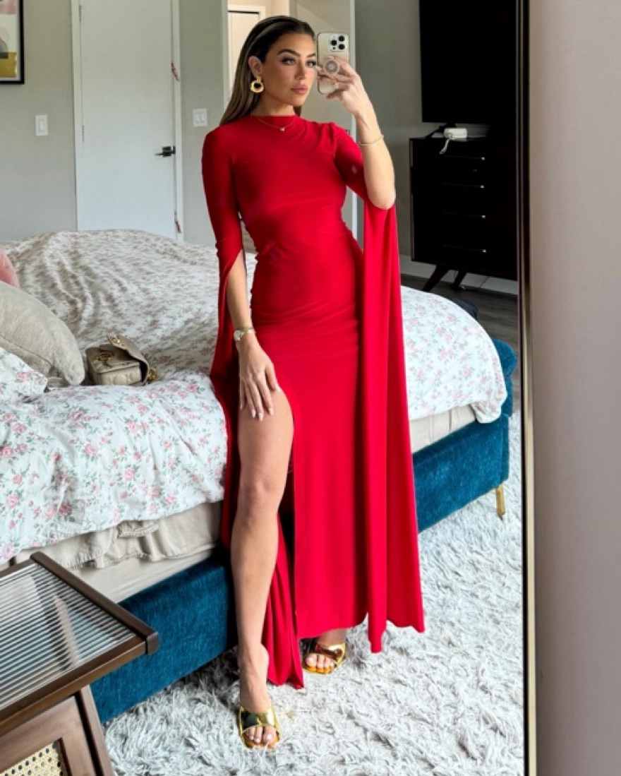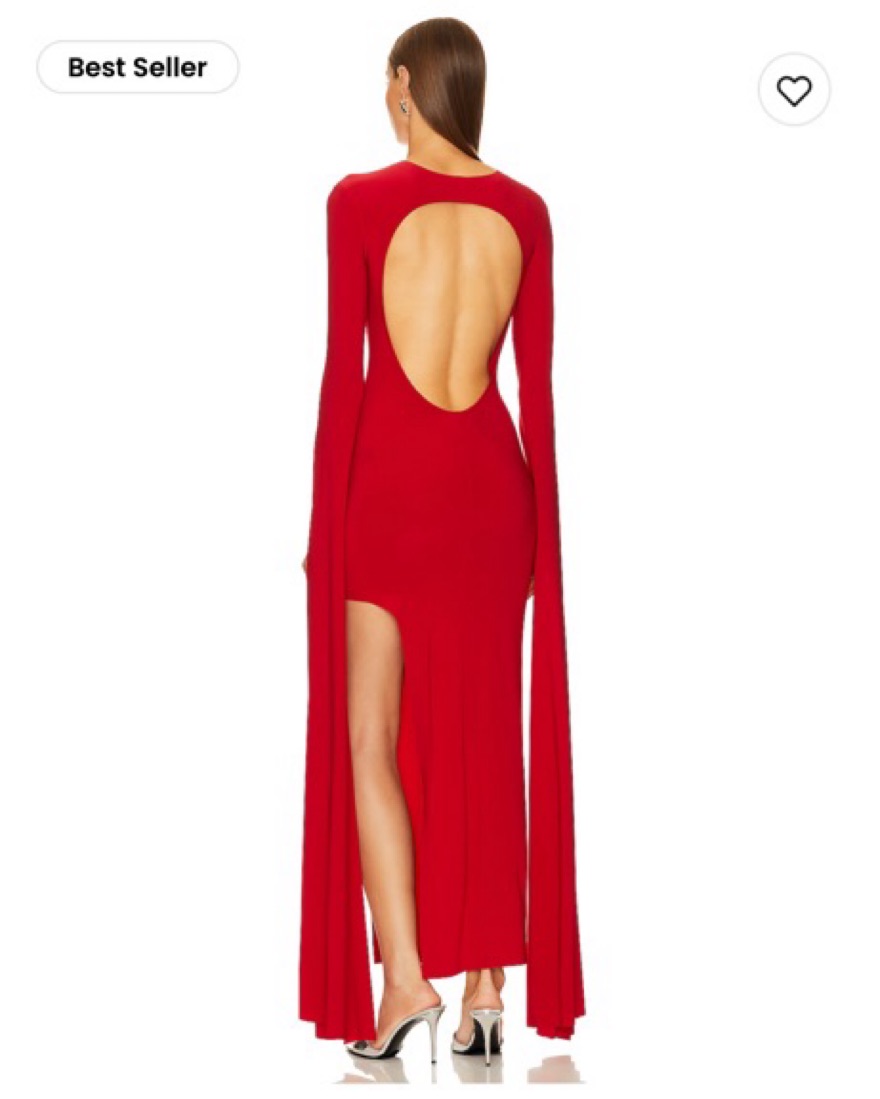 Norma Kamali - Open Back Ribbon Sleeve Wide Slit Gown in Tiger Red. Purchased from Revolve